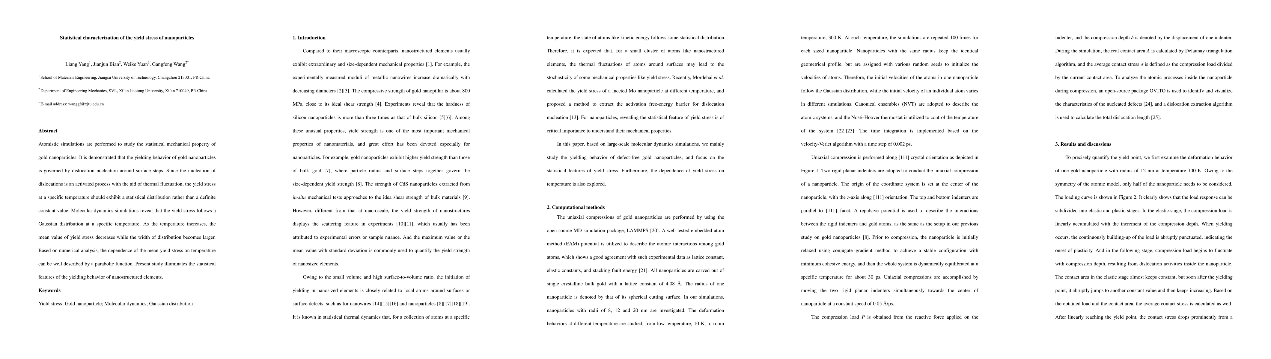 This paper uses atomistic simulations to show that gold nanoparticles' yielding behavior is driven by dislocation nucleation at surface steps, leading to a statistical distribution of yield stress influenced by thermal fluctuations. Molecular dynamics simulations reveal a Gaussian distribution of yield stress, with the mean decreasing and distribution width increasing as temperature rises, following a parabolic temperature dependence.