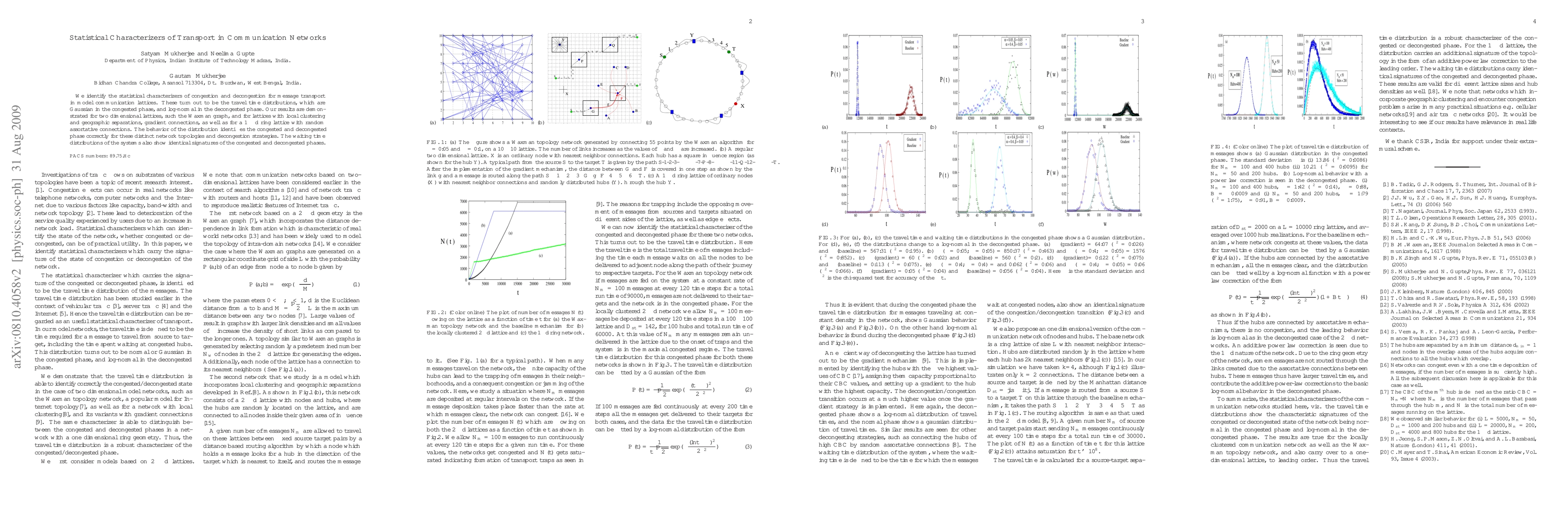 This paper identifies travel time distributions as statistical characterizers of congestion and decongestion in communication networks, finding Gaussian distributions in congested phases and log-normal distributions in decongested phases. The results apply to various network topologies, including Waxman graphs and 1-d ring lattices.