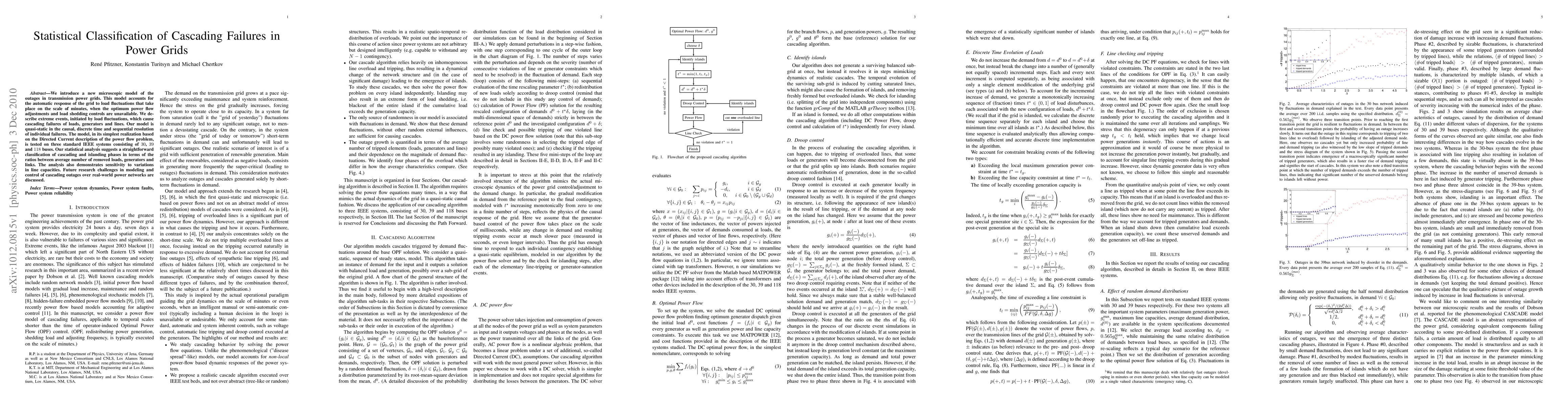 This paper presents a new microscopic model to simulate cascading failures in power grids due to load fluctuations, focusing on automatic grid responses. The model classifies cascading and islanding phases statistically based on removed components, highlighting sensitivity to line capacity variations.