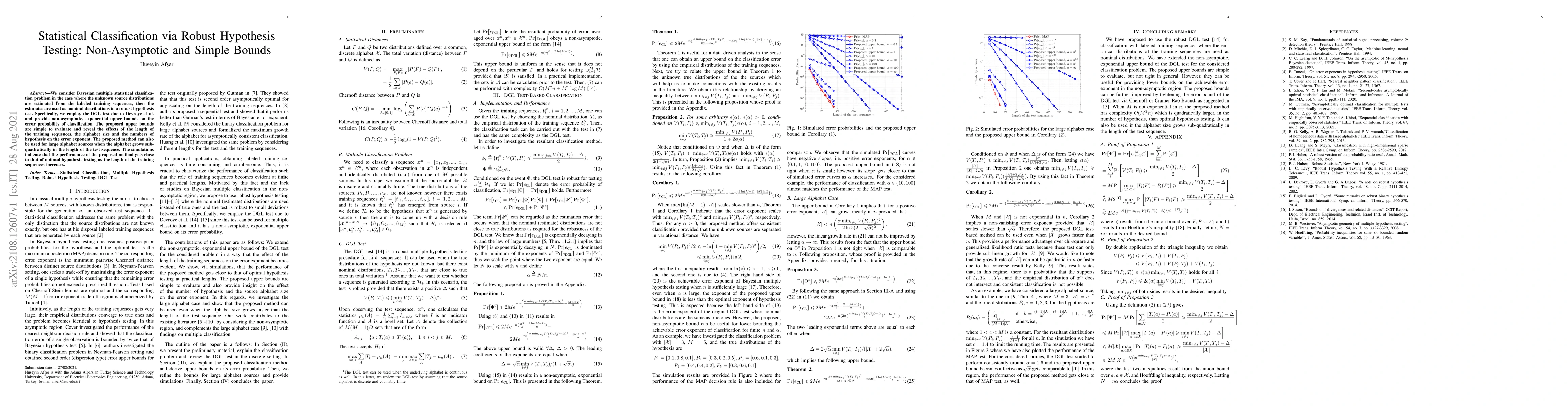 This paper presents a method for Bayesian classification using robust hypothesis testing, offering non-asymptotic, exponential error bounds. The approach, employing the DGL test, evaluates the impact of training sequence length, alphabet size, and number of hypotheses on classification error. It's applicable to large alphabet sources with sub-quadratic growth, and simulations show its performance nearing optimal testing as training sequence length increases.