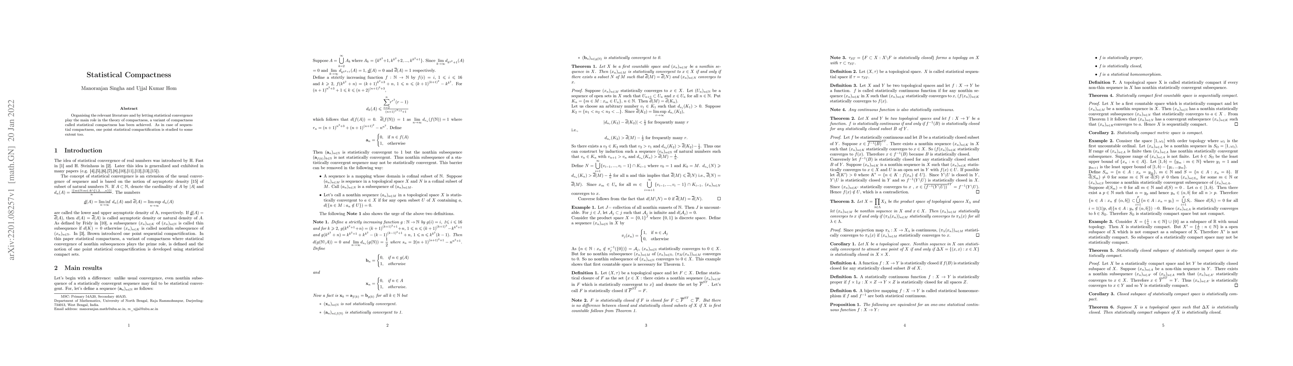 Summary: This paper introduces statistical compactness, a variant of traditional compactness, emphasizing statistical convergence. It explores one-point statistical compactification and compares it to sequential compactness.
