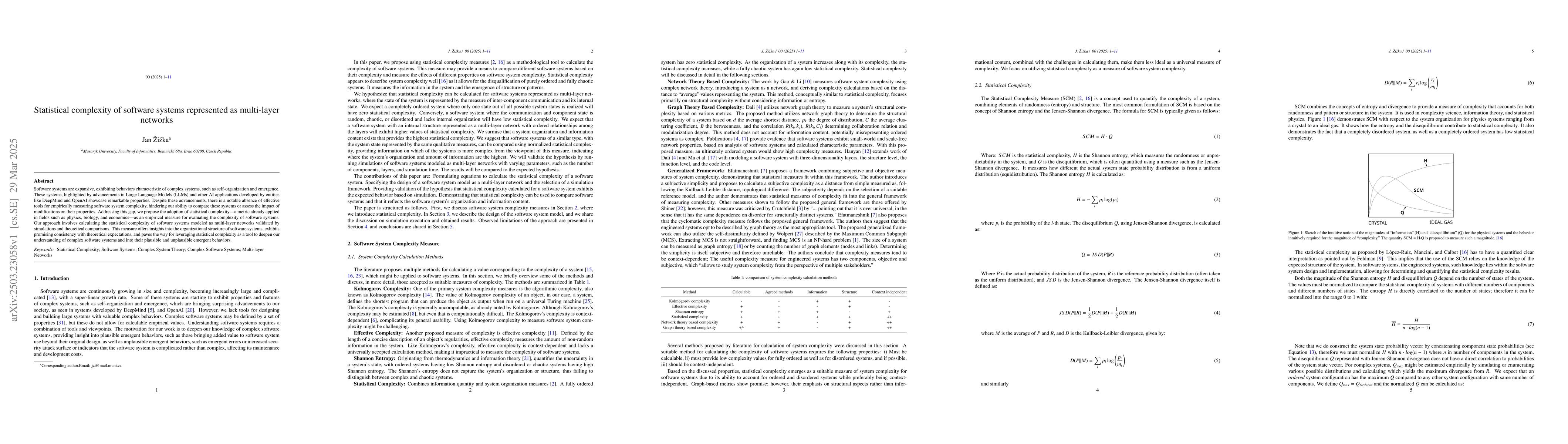 Software systems are expansive, exhibiting behaviors characteristic of complex systems, such as self-organization and emergence. These systems, highlighted by advancements in Large Language Models (LLMs) and other AI applications developed by entities like DeepMind and OpenAI showcase remarkable properties. Despite these advancements, there is a notable absence of effective tools for empirically measuring software system complexity, hindering our ability to compare these systems or assess the impact of modifications on their properties. Addressing this gap, we propose the adoption of statistical complexity, a metric already applied in fields such as physics, biology, and economics, as an empirical measure for evaluating the complexity of software systems. Our approach involves calculating the statistical complexity of software systems modeled as multi-layer networks validated by simulations and theoretical comparisons. This measure offers insights into the organizational structure of software systems, exhibits promising consistency with theoretical expectations, and paves the way for leveraging statistical complexity as a tool to deepen our understanding of complex software systems and into their plausible and unplausible emergent behaviors.