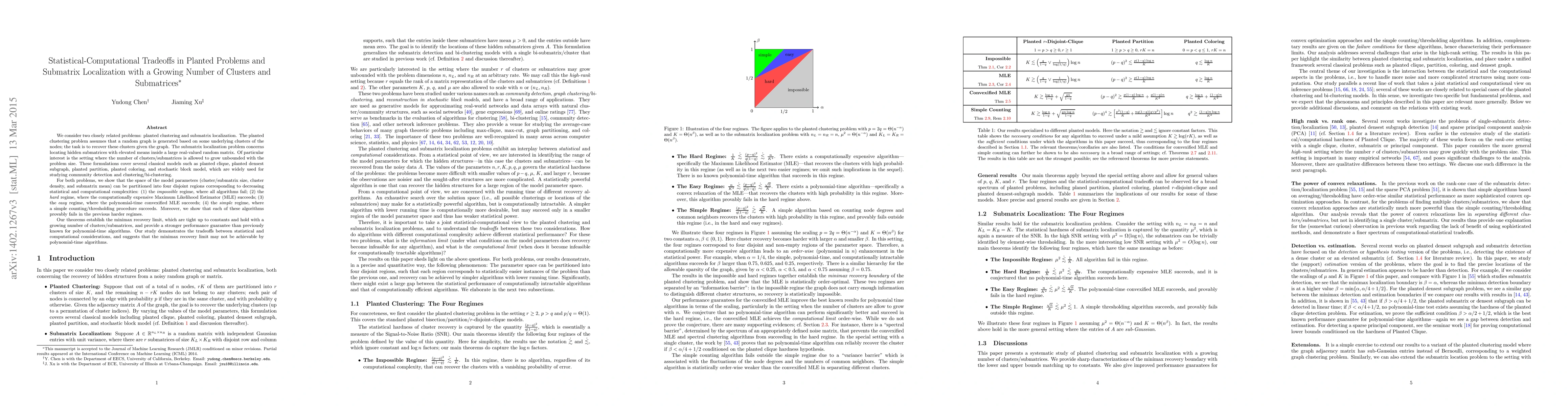 This paper investigates the statistical-computational tradeoffs in planted clustering and submatrix localization problems, showing four distinct regimes of complexity. It establishes the minimax recovery limit for growing clusters/submatrices and suggests that polynomial-time algorithms may not achieve the optimal statistical limit.