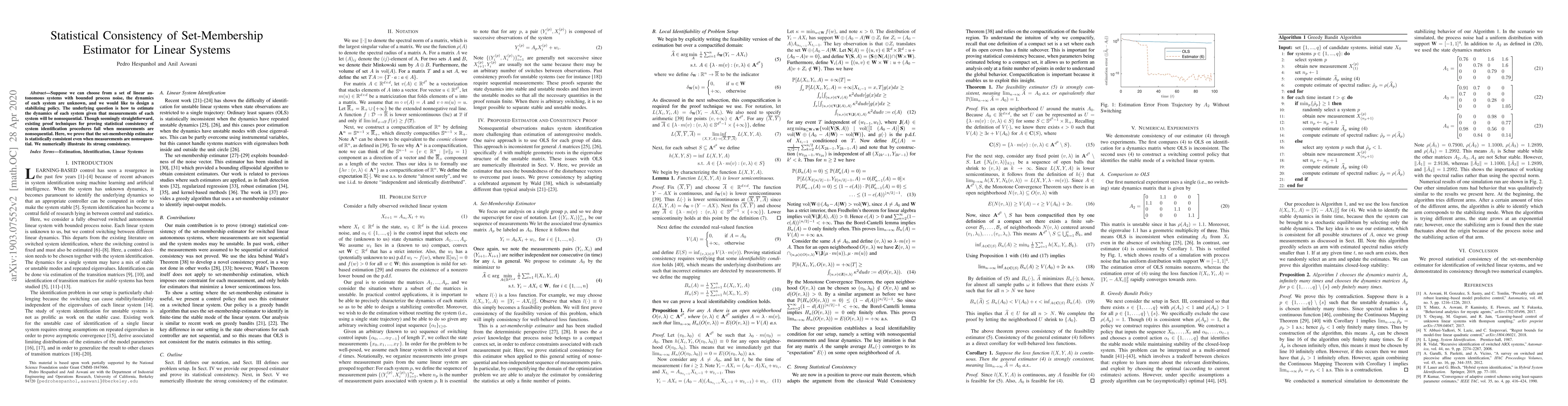 Suppose we can choose from a set of linear autonomous systems with bounded process noise, the dynamics of each system are unknown, and we would like to design a stabilizing policy. The underlying question is how to estimate the dynamics of each system given that measurements of each system will be nonsequential. Though seemingly straightforward, existing proof techniques for proving statistical consistency of system identification procedures fail when measurements are nonsequential. Here, we prove that the set-membership estimator is statistically consistent even when measurements are nonsequential. We numerically illustrate its strong consistency.