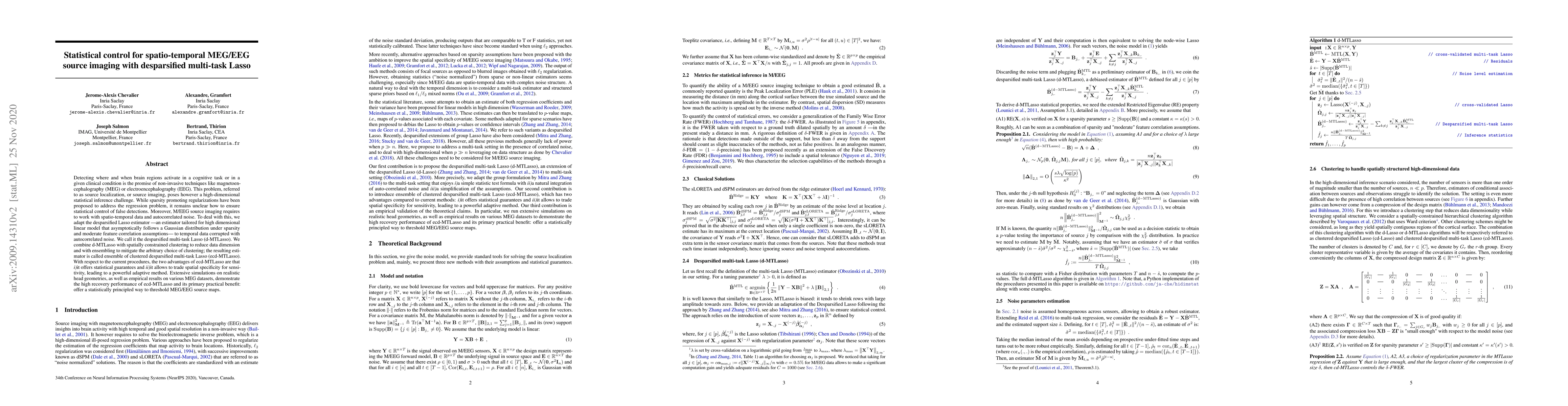 This paper proposes an ensemble of clustered desparsified multi-task Lasso (ecd-MTLasso) method for MEG/EEG source imaging, offering statistical control over false detections and the ability to balance spatial specificity and sensitivity. The method combines desparsified Lasso with spatially constrained clustering and ensembling to handle spatio-temporal data and autocorrelated noise, demonstrating high recovery performance and practical benefits in realistic simulations and MEG datasets.