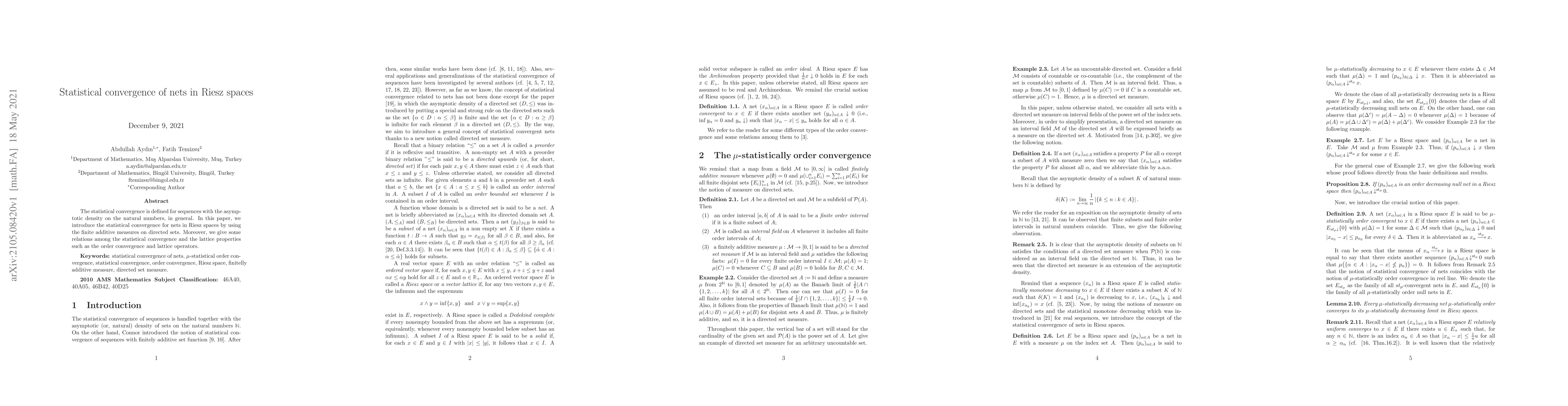 This paper introduces statistical convergence for nets in Riesz spaces using finite additive measures on directed sets and explores its relations with lattice properties like order convergence and lattice operators. It extends the concept of statistical convergence beyond sequences to a more general setting.