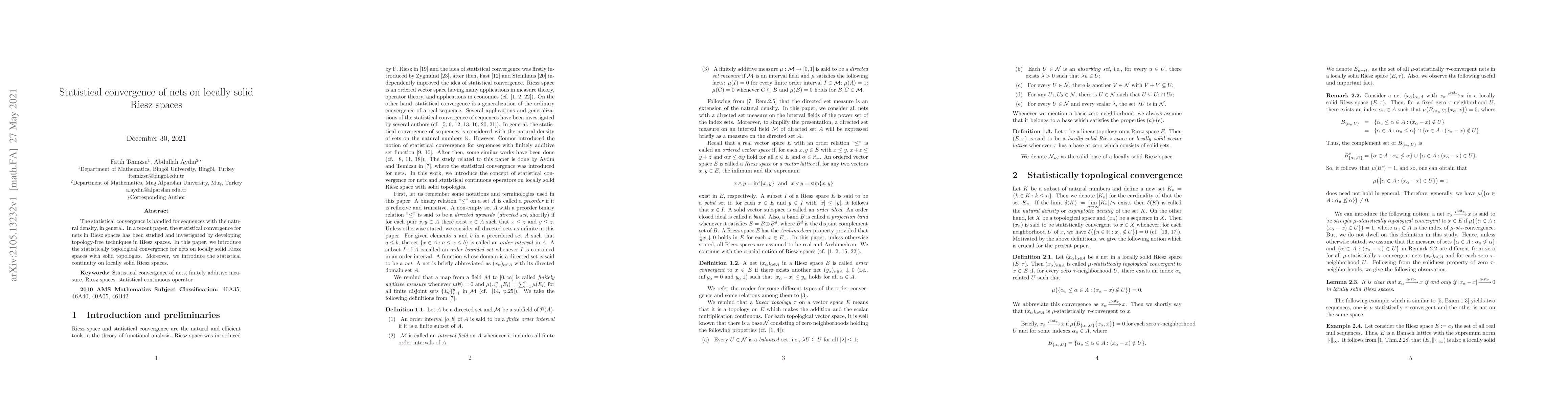 The statistical convergence is handled for sequences with the natural density, in general. In a recent paper, the statistical convergence for nets in Riesz spaces has been studied and investigated by developing topology-free techniques in Riesz spaces. In this paper, we introduce the statistically topological convergence for nets on locally solid Riesz spaces with solid topologies. Moreover, we introduce the statistical continuity on locally solid Riesz spaces.