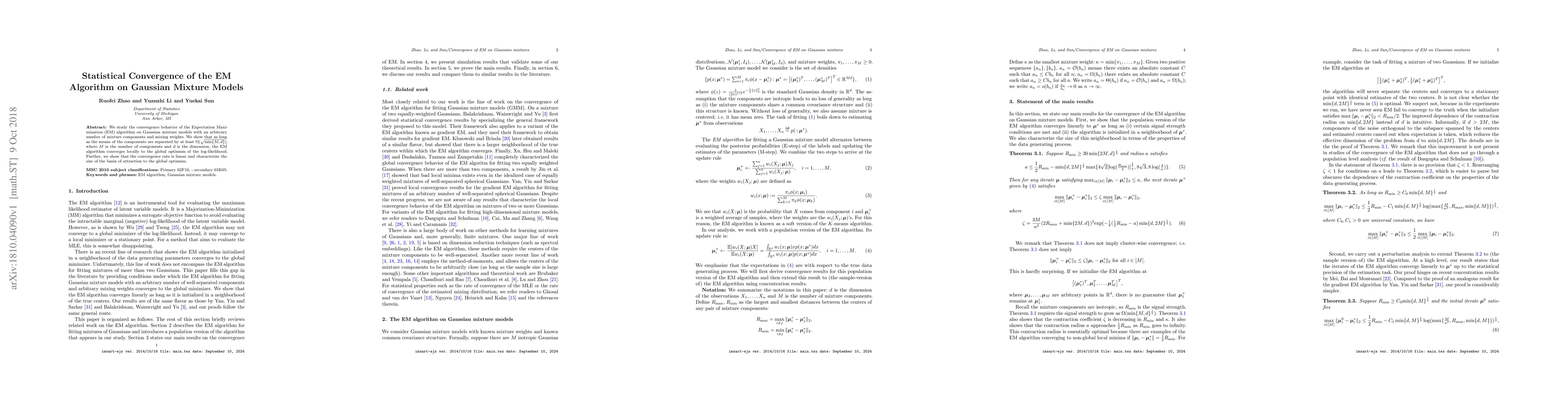 This paper investigates the statistical convergence of the EM algorithm for Gaussian mixture models, demonstrating that it converges locally to the global optimum when component means are sufficiently separated, with a linear convergence rate and a characterized basin of attraction.