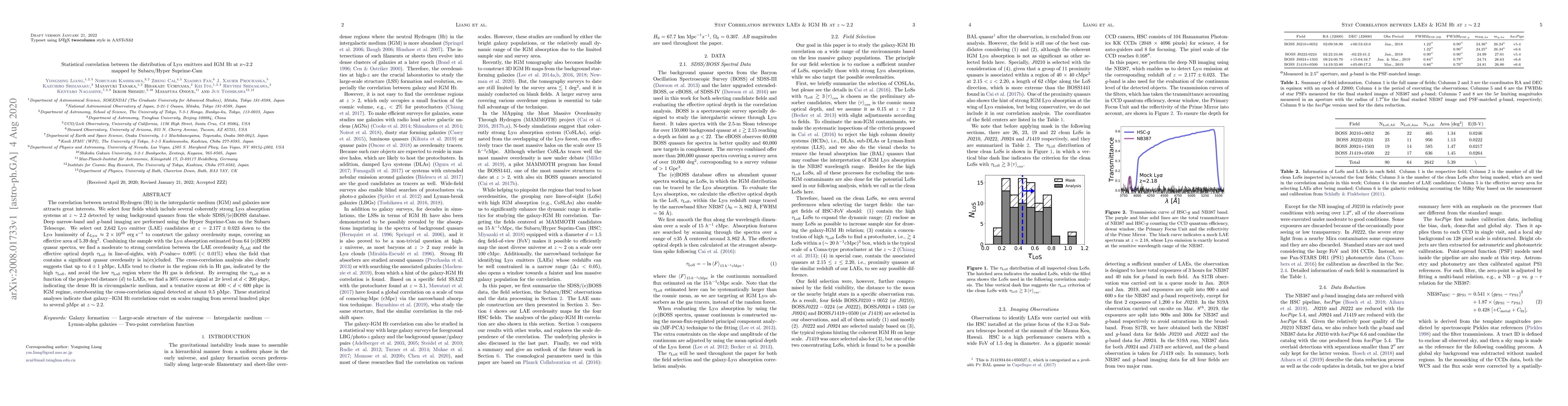 This study investigates the correlation between Lyα emitters (LAEs) and neutral Hydrogen (HI) in the intergalactic medium (IGM) at $z\sim2.2$. Using Subaru/Hyper Suprime-Cam data, the authors find a moderate to strong correlation between LAE overdensity and HI gas density, suggesting LAEs cluster in regions with high HI gas content.