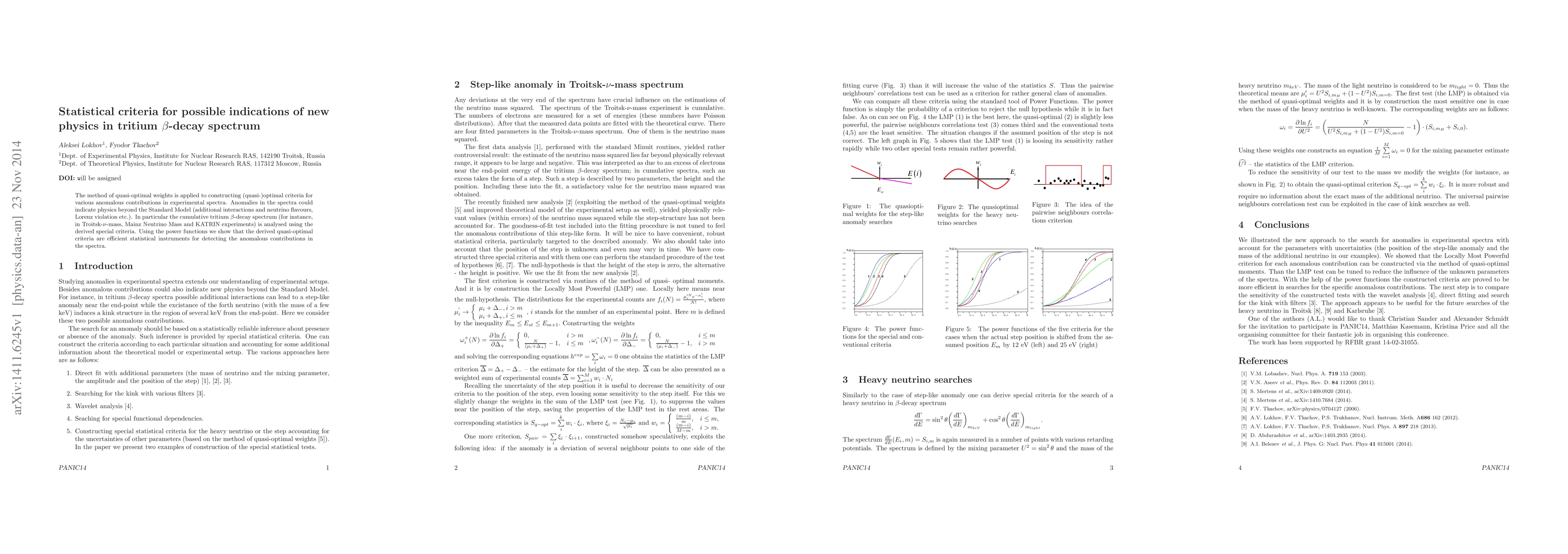 The method of quasi-optimal weights is applied to constructing (quasi-)optimal criteria for various anomalous contributions in experimental spectra. Anomalies in the spectra could indicate physics beyond the Standard Model (additional interactions and neutrino flavours, Lorenz violation etc.). In particular the cumulative tritium $\beta$-decay spectrum (for instance, in Troitsk-$\nu$-mass, Mainz Neutrino Mass and KATRIN experiments) is analysed using the derived special criteria. Using the power functions we show that the derived quasi-optimal criteria are efficient statistical instruments for detecting the anomalous contributions in the spectra.