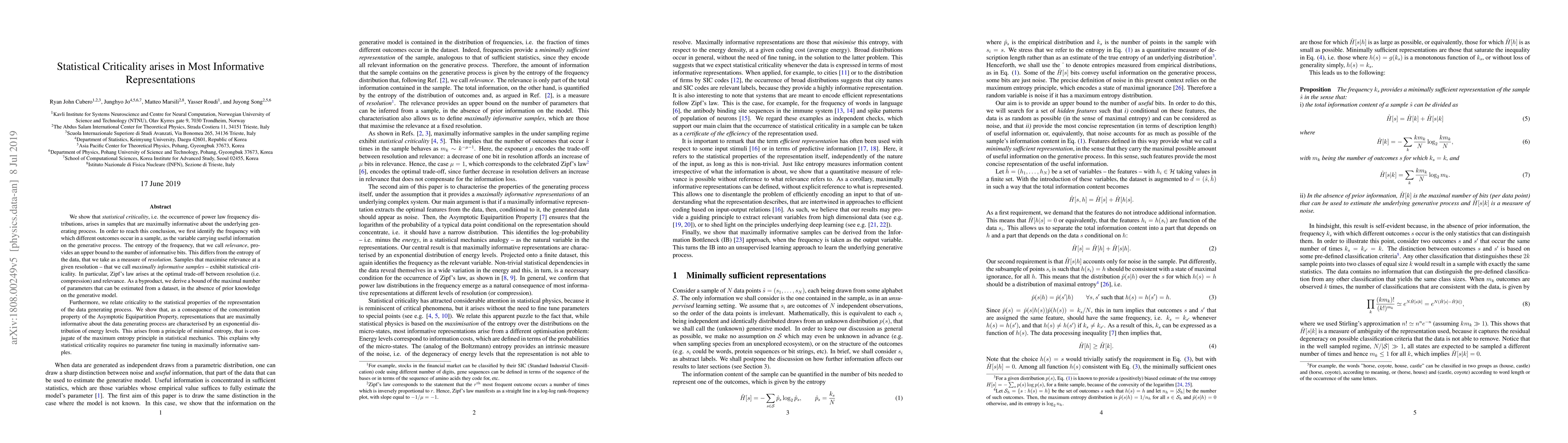 We show that statistical criticality, i.e. the occurrence of power law frequency distributions, arises in samples that are maximally informative about the underlying generating process. In order to reach this conclusion, we first identify the frequency with which different outcomes occur in a sample, as the variable carrying useful information on the generative process. The entropy of the frequency, that we call relevance, provides an upper bound to the number of informative bits. This differs from the entropy of the data, that we take as a measure of resolution. Samples that maximise relevance at a given resolution - that we call maximally informative samples - exhibit statistical criticality. In particular, Zipf's law arises at the optimal trade-off between resolution (i.e. compression) and relevance. As a byproduct, we derive a bound of the maximal number of parameters that can be estimated from a dataset, in the absence of prior knowledge on the generative model. Furthermore, we relate criticality to the statistical properties of the representation of the data generating process. We show that, as a consequence of the concentration property of the Asymptotic Equipartition Property, representations that are maximally informative about the data generating process are characterised by an exponential distribution of energy levels. This arises from a principle of minimal entropy, that is conjugate of the maximum entropy principle in statistical mechanics. This explains why statistical criticality requires no parameter fine tuning in maximally informative samples.