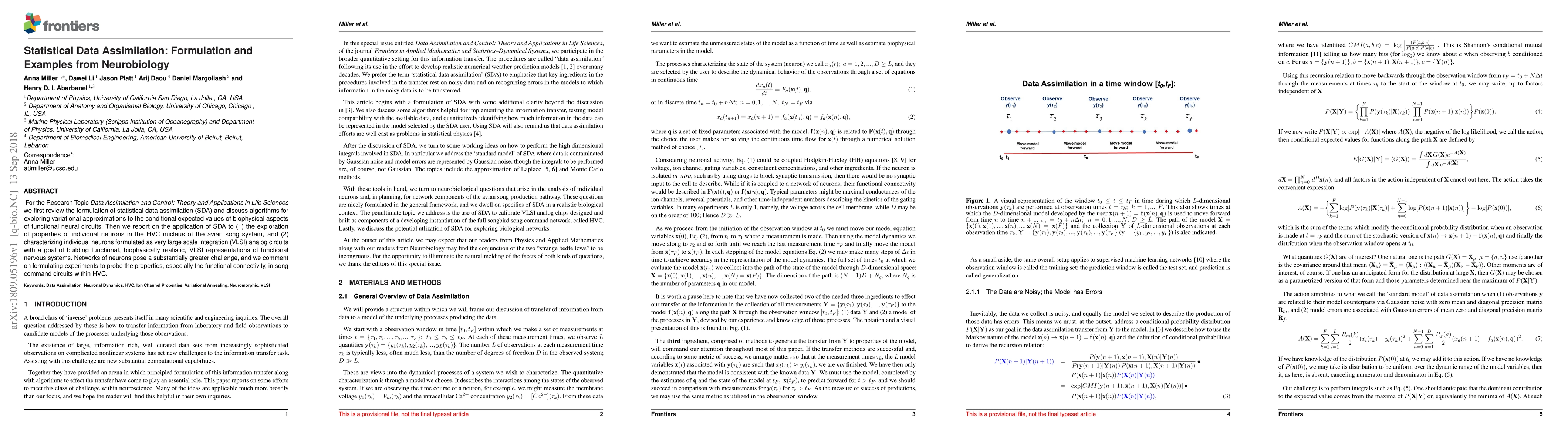 For the Research Topic Data Assimilation and Control: Theory and Applications in Life Sciences we first review the formulation of statistical data assimilation (SDA) and discuss algorithms for exploring variational approximations to the conditional expected values of biophysical aspects of functional neural circuits. Then we report on the application of SDA to (1) the exploration of properties of individual neurons in the HVC nucleus of the avian song system, and (2) characterizing individual neurons formulated as very large scale integration (VLSI) analog circuits with a goal of building functional, biophysically realistic, VLSI representations of functional nervous systems. Networks of neurons pose a substantially greater challenge, and we comment on formulating experiments to probe the properties, especially the functional connectivity, in song command circuits within HVC.