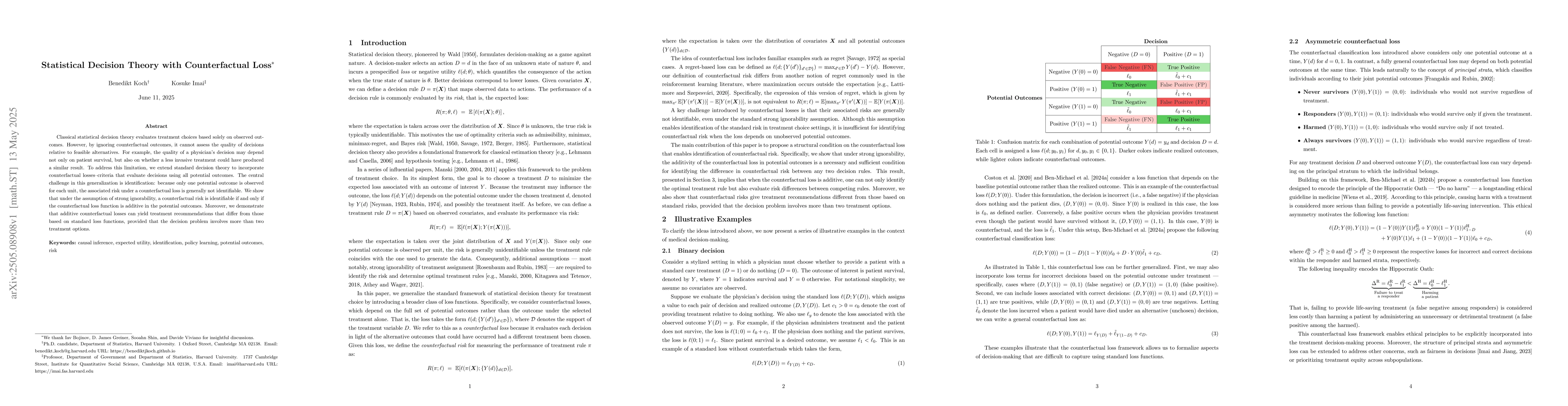 The paper introduces a generalized statistical decision theory framework that incorporates counterfactual losses, providing conditions for identifiability and demonstrating its potential to alter treatment recommendations.