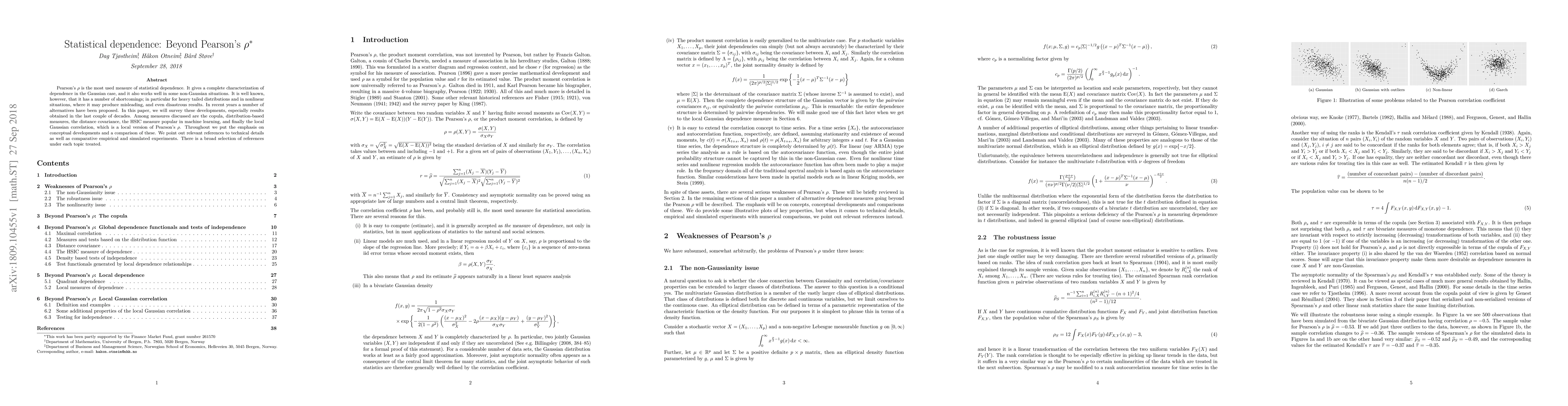 This paper surveys recent alternatives to Pearson's $ ho$, a measure of statistical dependence, highlighting its shortcomings in non-Gaussian distributions and nonlinear situations. It discusses various measures like copula, distribution-based measures, distance covariance, HSIC, and local Gaussian correlation, comparing their conceptual developments and empirical performance.
