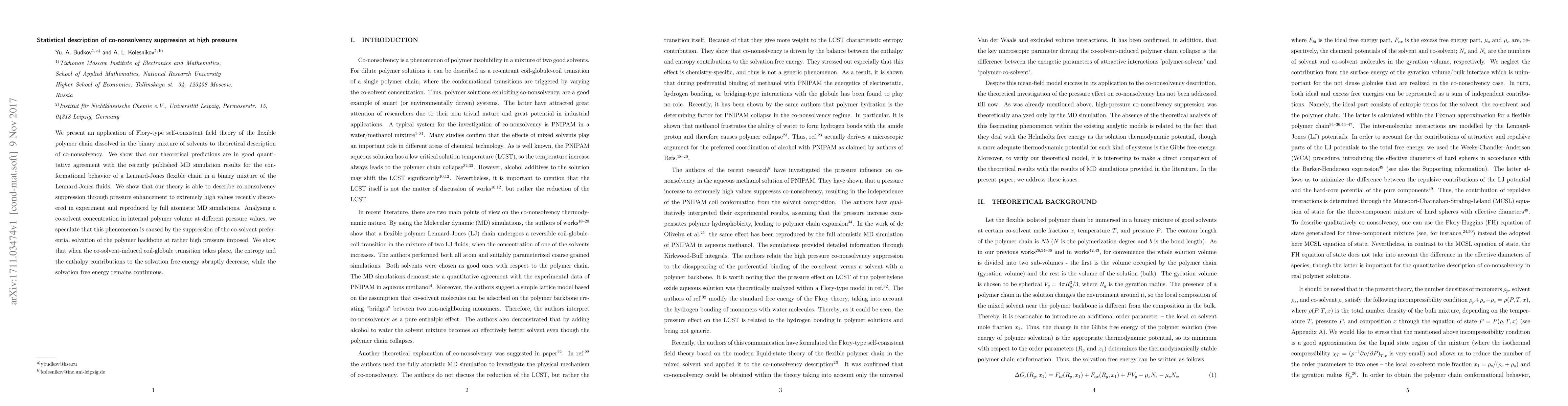 Researchers used a self-consistent field theory to describe co-nonsolvency suppression under high pressure, showing good agreement with MD simulation results. They suggest that the phenomenon is caused by suppressed preferential solvation of the polymer backbone at high pressures.