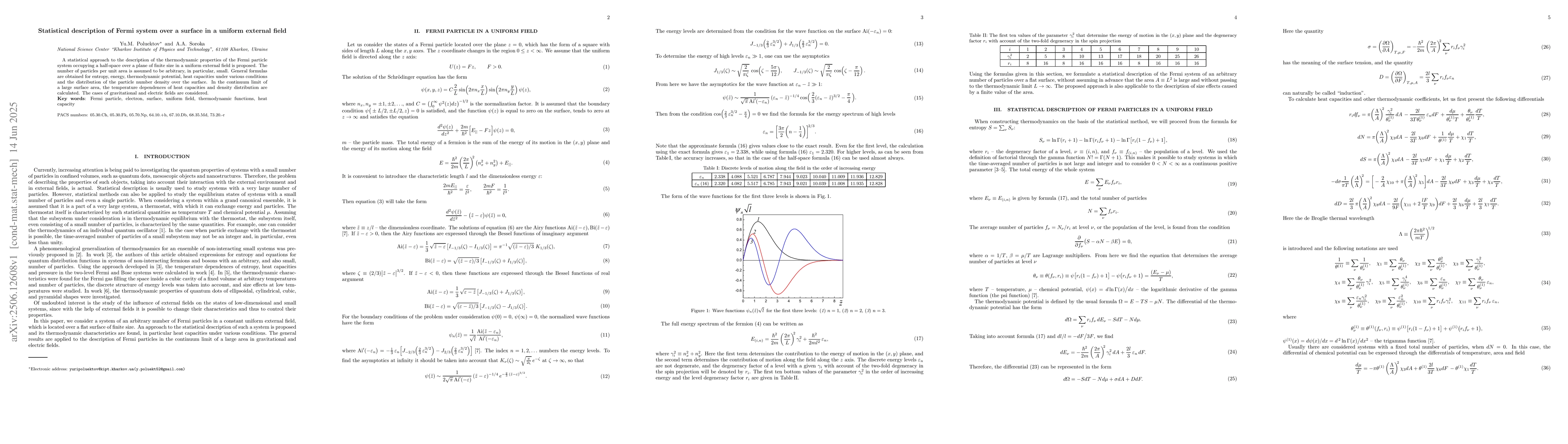 A statistical approach to the description of the thermodynamic properties of the Fermi particle system occupying a half-space over a plane of finite size in a uniform external field is proposed. The number of particles per unit area is assumed to be arbitrary, in particular, small. General formulas are obtained for entropy, energy, thermodynamic potential, heat capacities under various conditions and the distribution of the particle number density over the surface. In the continuum limit of a large surface area, the temperature dependences of heat capacities and density distribution are calculated. The cases of gravitational and electric fields are considered.