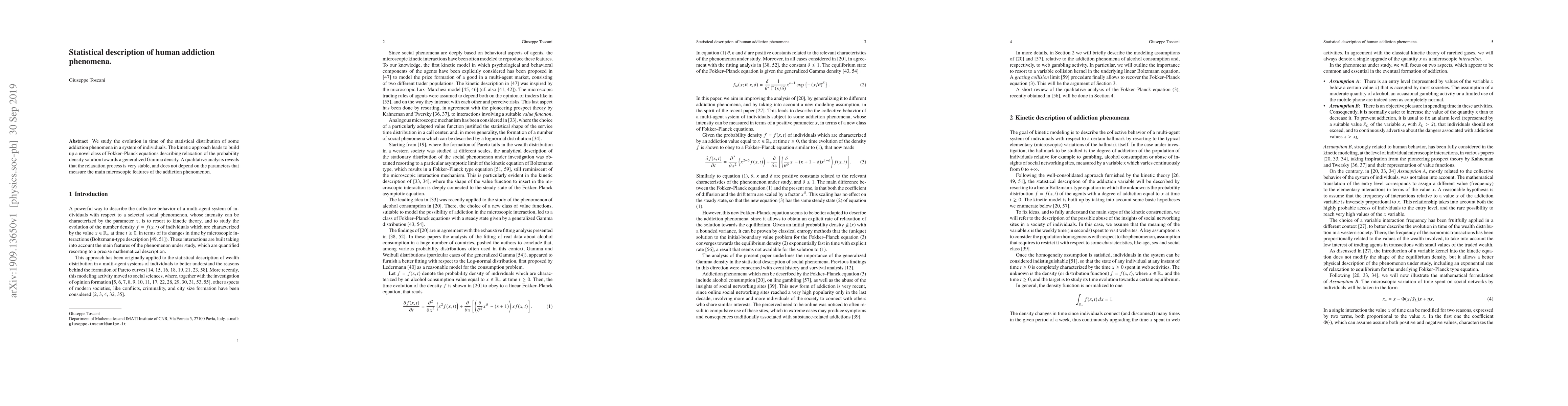 We study the evolution in time of the statistical distribution of some addiction phenomena in a system of individuals. The kinetic approach leads to build up a novel class of Fokker--Planck equations describing relaxation of the probability density solution towards a generalized Gamma density. A qualitative analysis reveals that the relaxation process is very stable, and does not depend on the parameters that measure the main microscopic features of the addiction phenomenon.