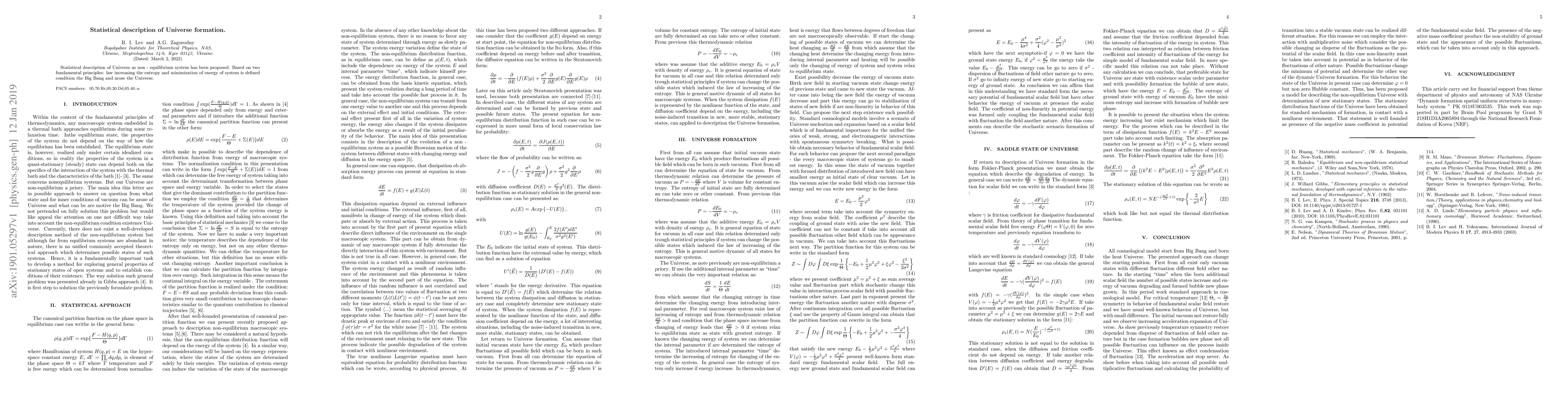 Statistical description of the Universe as non-equilibrium system has been proposed. Based on two fundamental principles, i.e., the law of increasing entropy and the principle of minimum energy of the system and try to answer the question of what the reasons of the Big Bang and the birth of the Universe were.