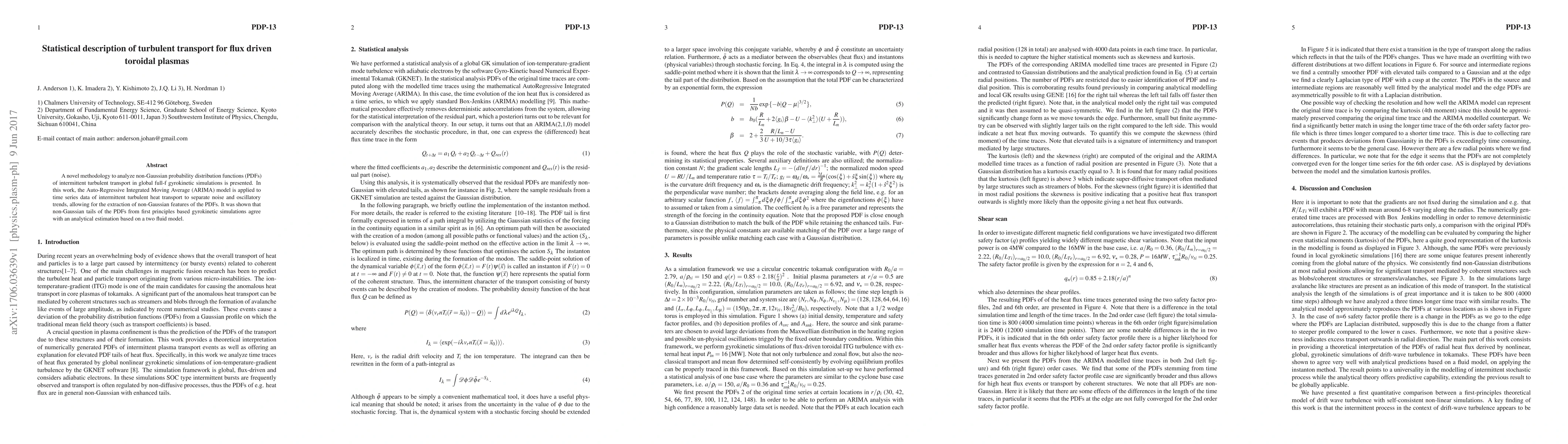 This paper introduces a new method using the ARIMA model to analyze non-Gaussian probability distributions in turbulent transport simulations, revealing agreement between simulation results and analytical estimates from a two fluid model. The ARIMA model helps isolate non-Gaussian features in the turbulent heat transport time series.