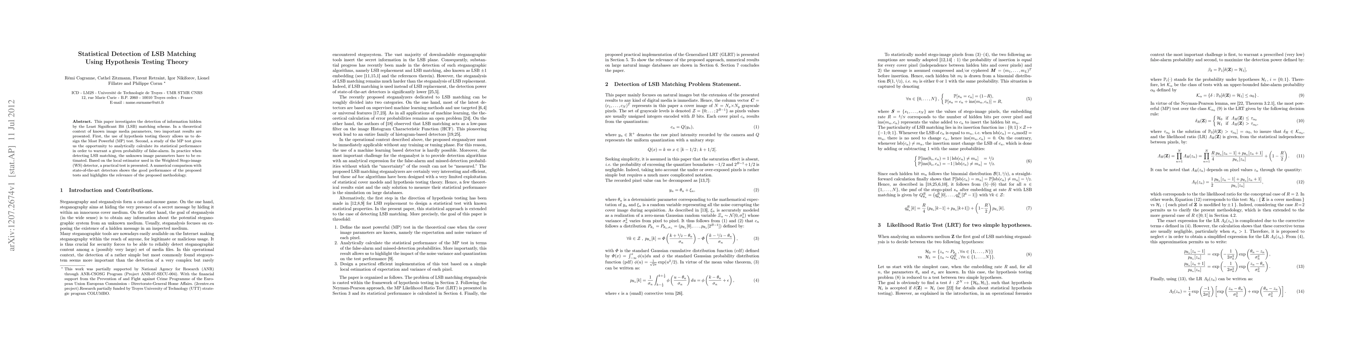 This paper develops statistical tests for detecting information hidden via LSB matching, utilizing hypothesis testing theory to design the Most Powerful test and analytically calculate its performance. A practical test is proposed based on local estimator methods, which compares favorably with state-of-the-art detectors.