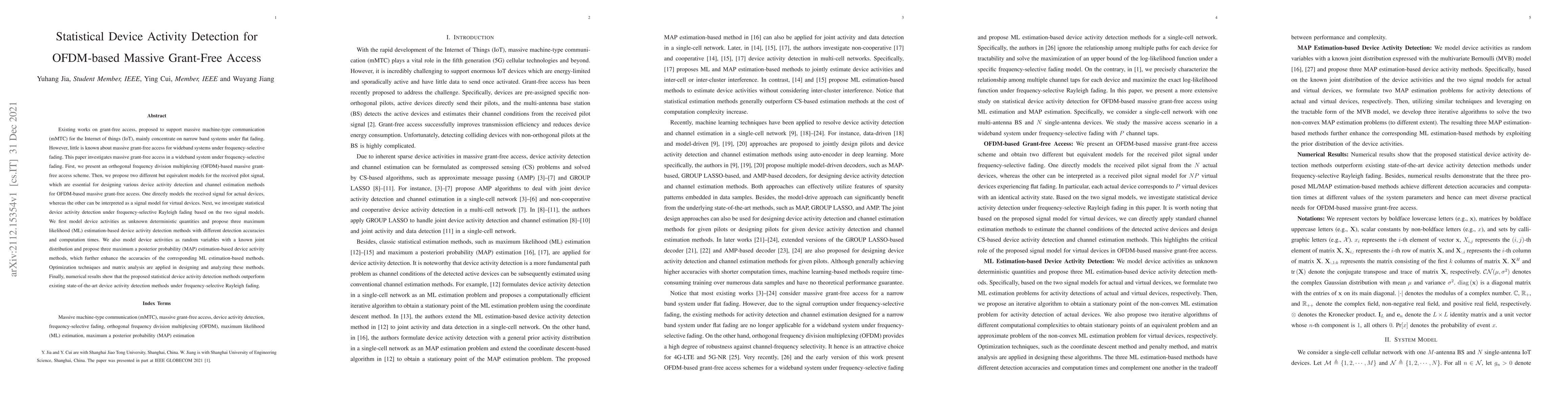 Existing works on grant-free access, proposed to support massive machine-type communication (mMTC) for the Internet of things (IoT), mainly concentrate on narrow band systems under flat fading. However, little is known about massive grant-free access for wideband systems under frequency-selective fading. This paper investigates massive grant-free access in a wideband system under frequency-selective fading. First, we present an orthogonal frequency division multiplexing (OFDM)-based massive grant-free access scheme. Then, we propose two different but equivalent models for the received pilot signal, which are essential for designing various device activity detection and channel estimation methods for OFDM-based massive grant-free access. One directly models the received signal for actual devices, whereas the other can be interpreted as a signal model for virtual devices. Next, we investigate statistical device activity detection under frequency-selective Rayleigh fading based on the two signal models. We first model device activities as unknown deterministic quantities and propose three maximum likelihood (ML) estimation-based device activity detection methods with different detection accuracies and computation times. We also model device activities as random variables with a known joint distribution and propose three maximum a posterior probability (MAP) estimation-based device activity methods, which further enhance the accuracies of the corresponding ML estimation-based methods. Optimization techniques and matrix analysis are applied in designing and analyzing these methods. Finally, numerical results show that the proposed statistical device activity detection methods outperform existing state-of-the-art device activity detection methods under frequency-selective Rayleigh fading.