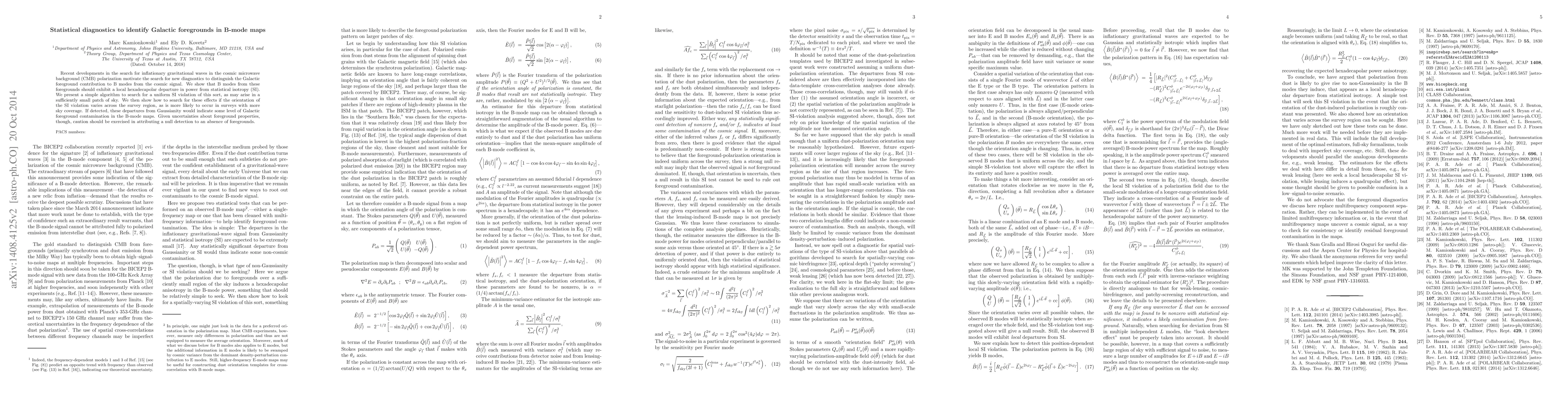 Recent developments in the search for inflationary gravitational waves in the cosmic microwave background (CMB) polarization motivate the search for new diagnostics to distinguish the Galactic foreground contribution to B modes from the cosmic signal. We show that B modes from these foregrounds should exhibit a local hexadecapolar departure in power from statistical isotropy (SI). We present a simple algorithm to search for a uniform SI violation of this sort, as may arise in a sufficiently small patch of sky. We then show how to search for these effects if the orientation of the SI violation varies across the survey region, as is more likely to occur in surveys with more sky coverage. If detected, these departures from Gaussianity would indicate some level of Galactic foreground contamination in the B-mode maps. Given uncertainties about foreground properties, though, caution should be exercised in attributing a null detection to an absence of foregrounds.