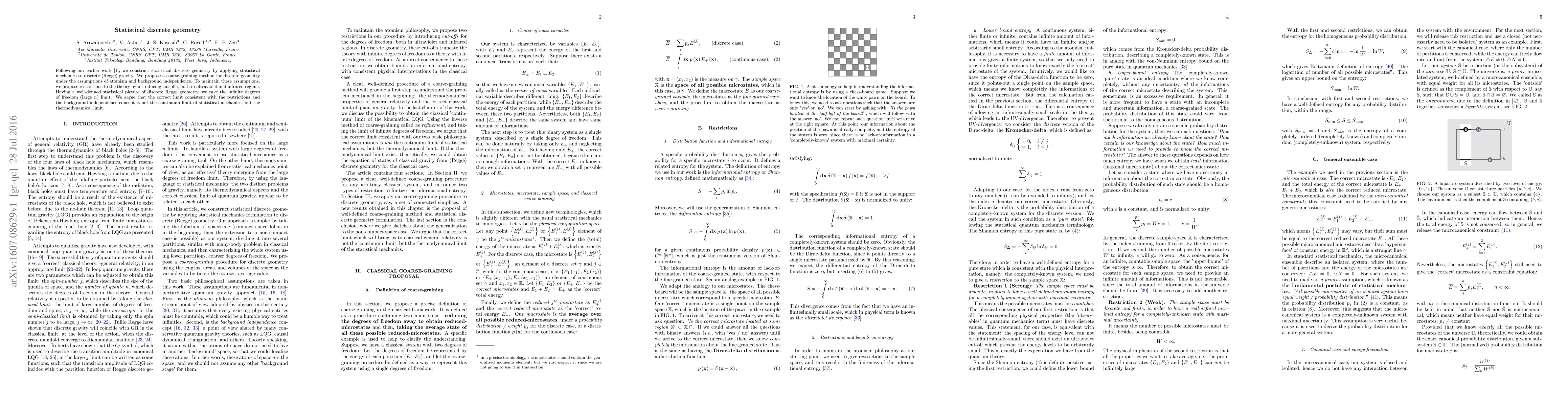 This paper constructs statistical discrete geometry by applying statistical mechanics to discrete (Regge) gravity, proposing a coarse-graining method under atomism and background independence, and arguing that the thermodynamical limit, rather than the continuum limit, is the correct limit consistent with these assumptions.