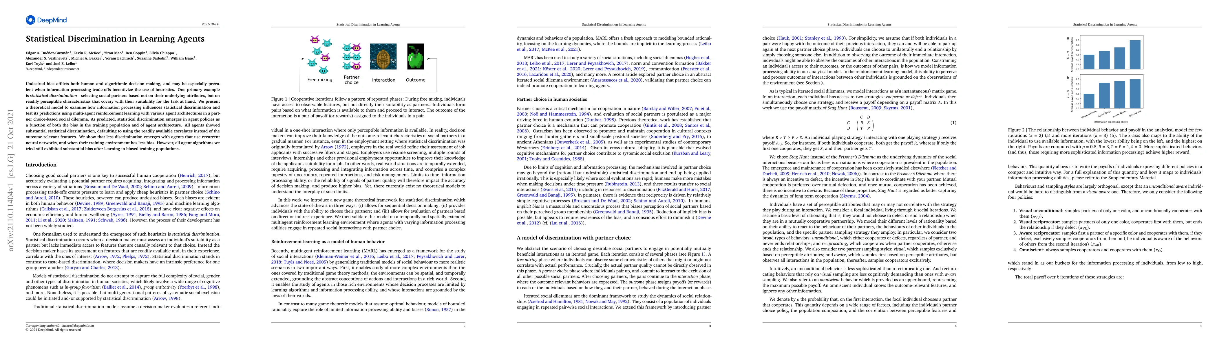 This paper explores statistical discrimination in learning agents, demonstrating that agents tend to select social partners based on easily perceptible characteristics rather than their true suitability. The study finds that agents exhibit significant bias, especially when trained in biased environments, though less biased agents use recurrent neural networks.