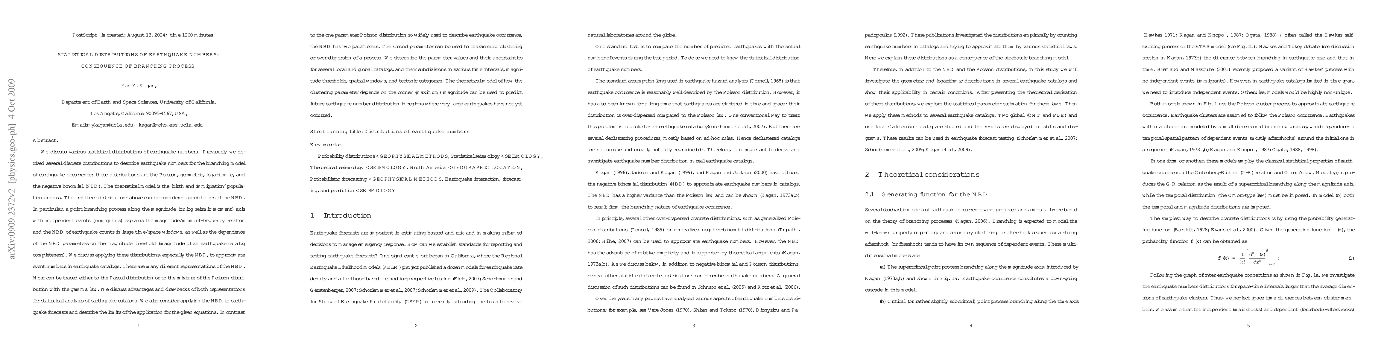 This paper explores statistical distributions for earthquake numbers, deriving discrete distributions like Poisson, geometric, logarithmic, and the negative binomial (NBD) within a branching process model. It emphasizes the NBD's applicability to earthquake catalogs and forecasts, highlighting its two-parameter flexibility over the one-parameter Poisson model, and discusses the NBD's advantages and limitations for statistical analysis.