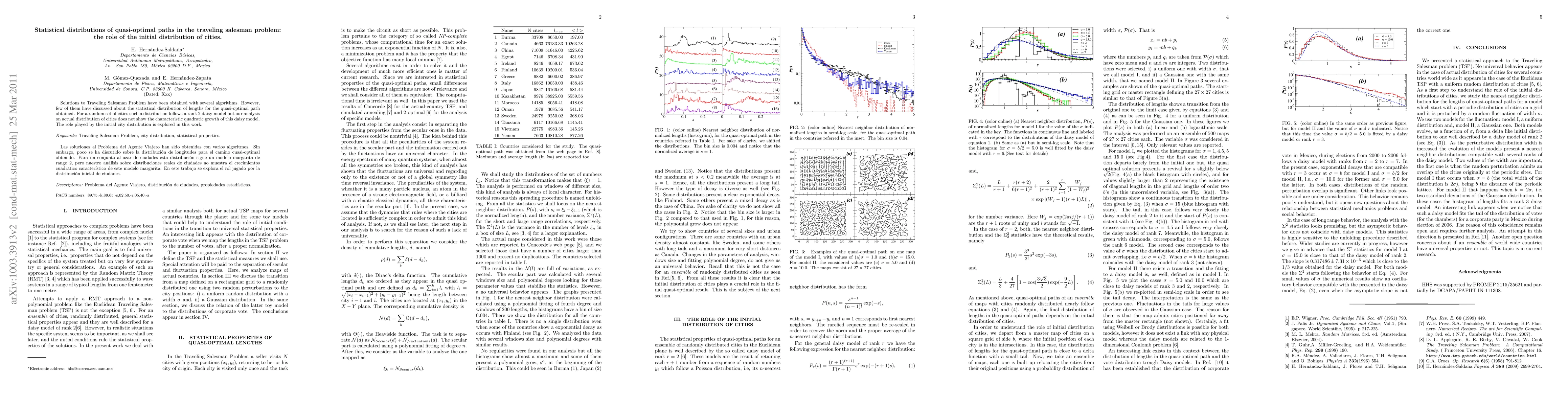 This paper investigates the statistical distribution of quasi-optimal paths in the Traveling Salesman Problem, finding that actual city distributions deviate from the expected rank 2 daisy model. It explores the influence of the initial city distribution and highlights its relevance in electoral processes.