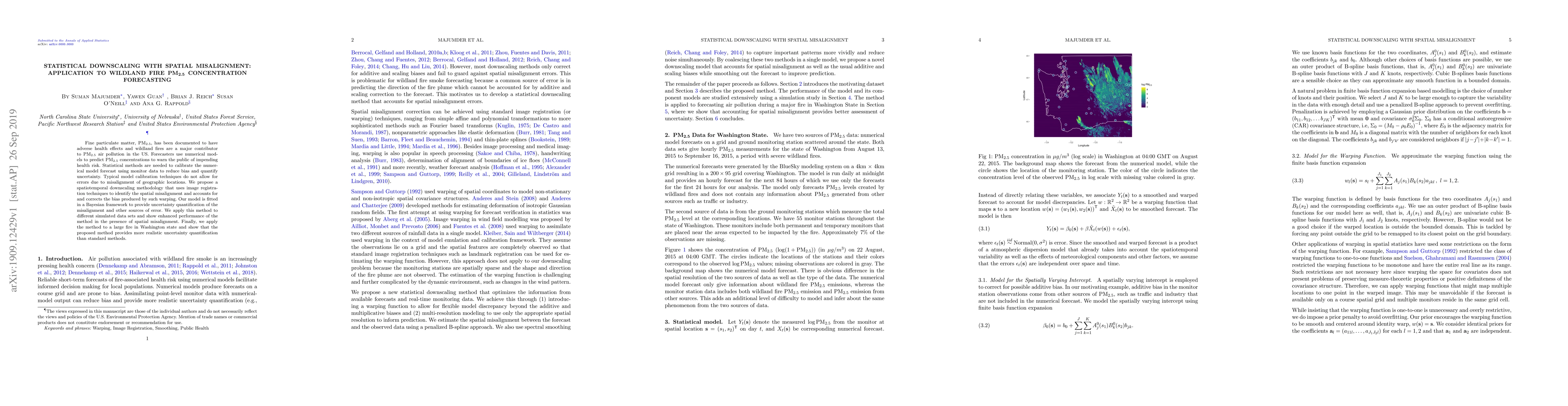 Fine particulate matter, PM$_{2.5}$, has been documented to have adverse health effects and wildland fires are a major contributor to PM$_{2.5}$ air pollution in the US. Forecasters use numerical models to predict PM$_{2.5}$ concentrations to warn the public of impending health risk. Statistical methods are needed to calibrate the numerical model forecast using monitor data to reduce bias and quantify uncertainty. Typical model calibration techniques do not allow for errors due to misalignment of geographic locations. We propose a spatiotemporal downscaling methodology that uses image registration techniques to identify the spatial misalignment and accounts for and corrects the bias produced by such warping. Our model is fitted in a Bayesian framework to provide uncertainty quantification of the misalignment and other sources of error. We apply this method to different simulated data sets and show enhanced performance of the method in the presence of spatial misalignment. Finally, we apply the method to a large fire in Washington state and show that the proposed method provides more realistic uncertainty quantification than standard methods.