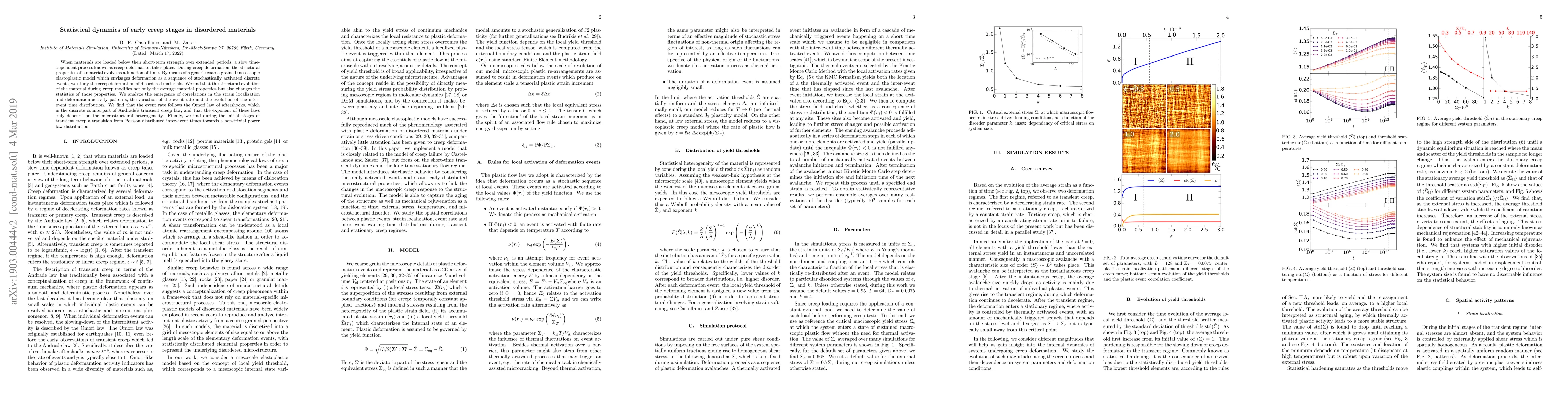 This paper investigates the statistical dynamics of early creep stages in disordered materials using a coarse-grained mesoscopic elastoplastic model. It finds that creep deformation alters both average material properties and their statistical distributions, revealing a transition from Poisson to power law inter-event time distributions and an Omori law governing the event rate.