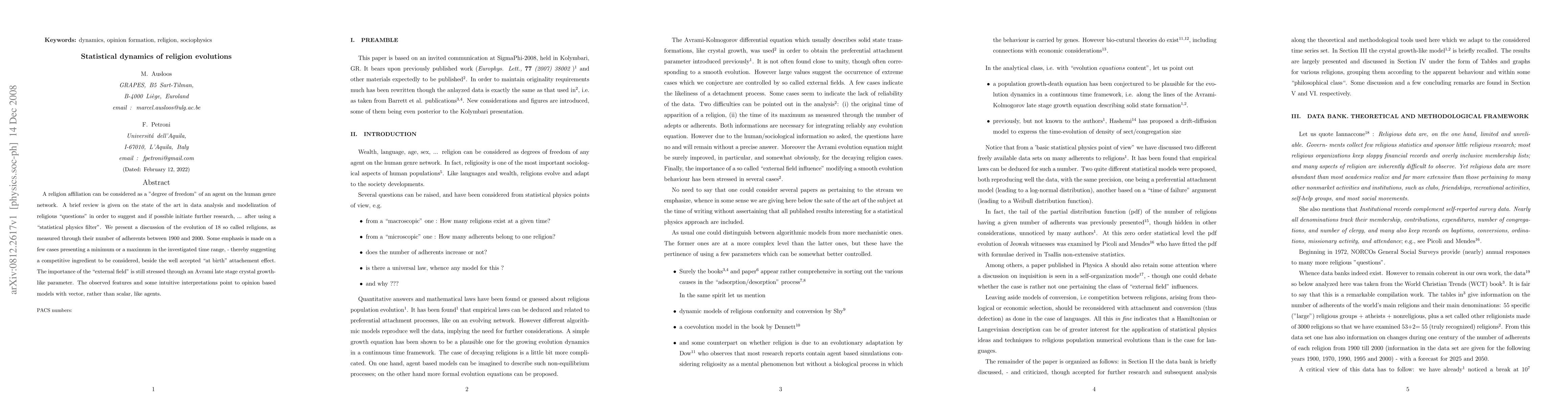 A religion affiliation can be considered as a "degree of freedom" of an agent on the human genre network. A brief review is given on the state of the art in data analysis and modelization of religious "questions" in order to suggest and if possible initiate further research, ... after using a "statistical physics filter". We present a discussion of the evolution of 18 so called religions, as measured through their number of adherents between 1900 and 2000. Some emphasis is made on a few cases presenting a minimum or a maximum in the investigated time range, - thereby suggesting a competitive ingredient to be considered, beside the well accepted "at birth" attachement effect. The importance of the "external field" is still stressed through an Avrami late stage crystal growth-like parameter. The observed features and some intuitive interpretations point to opinion based models with vector, rather than scalar, like agents.