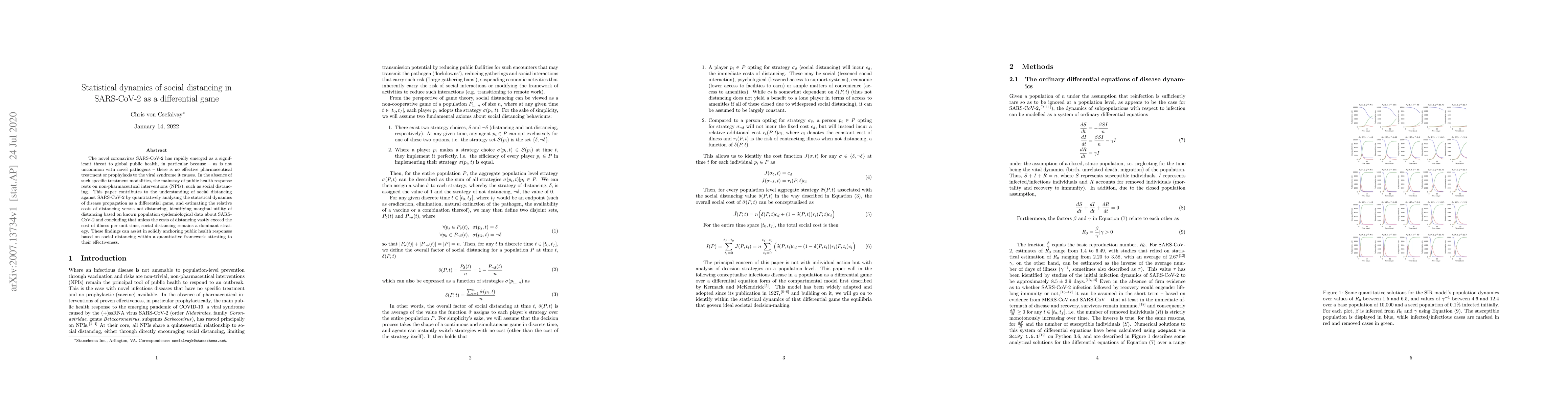 This paper uses a differential game framework to analyze the statistical dynamics of SARS-CoV-2 propagation and the effectiveness of social distancing as a non-pharmaceutical intervention. It concludes that social distancing remains a dominant strategy unless its costs vastly exceed the cost of illness, providing a quantitative basis for public health responses.