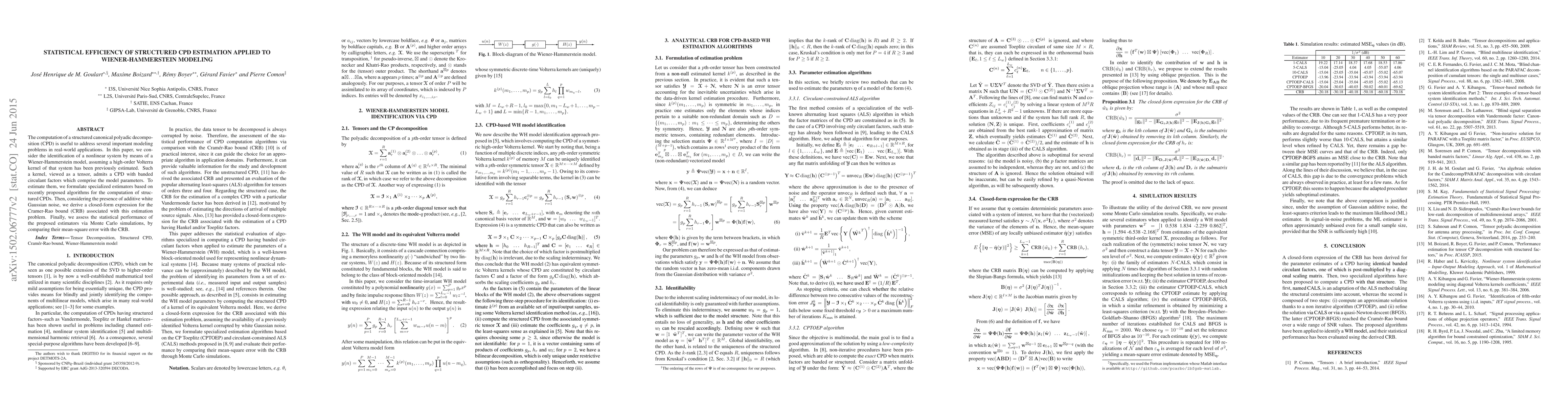 This paper proposes specialized estimators for identifying a Wiener-Hammerstein model using structured canonical polyadic decomposition (CPD) and assesses their statistical efficiency by comparing mean-square error to the Cramer-Rao bound (CRB) in Monte Carlo simulations.