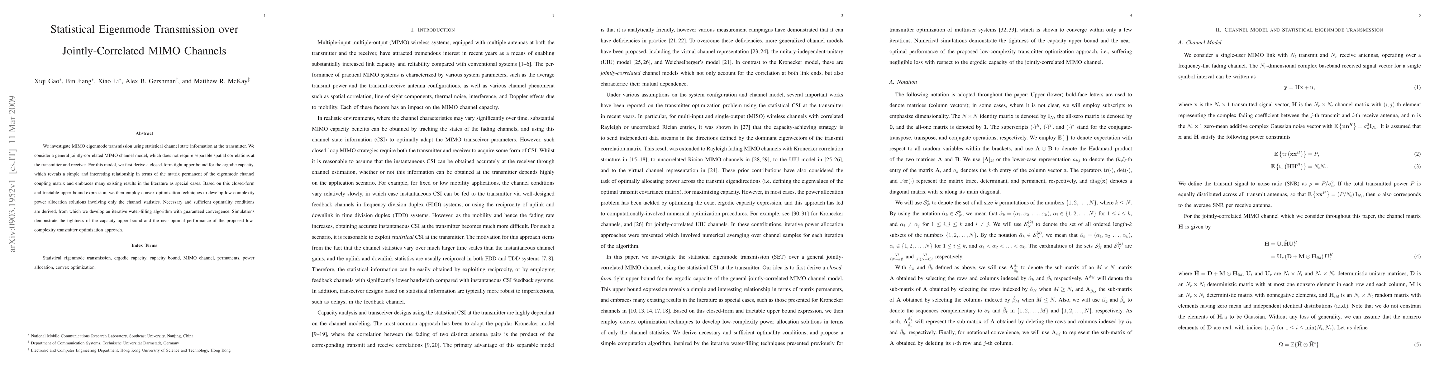 We investigate MIMO eigenmode transmission using statistical channel state information at the transmitter. We consider a general jointly-correlated MIMO channel model, which does not require separable spatial correlations at the transmitter and receiver. For this model, we first derive a closed-form tight upper bound for the ergodic capacity, which reveals a simple and interesting relationship in terms of the matrix permanent of the eigenmode channel coupling matrix and embraces many existing results in the literature as special cases. Based on this closed-form and tractable upper bound expression, we then employ convex optimization techniques to develop low-complexity power allocation solutions involving only the channel statistics. Necessary and sufficient optimality conditions are derived, from which we develop an iterative water-filling algorithm with guaranteed convergence. Simulations demonstrate the tightness of the capacity upper bound and the near-optimal performance of the proposed low-complexity transmitter optimization approach.