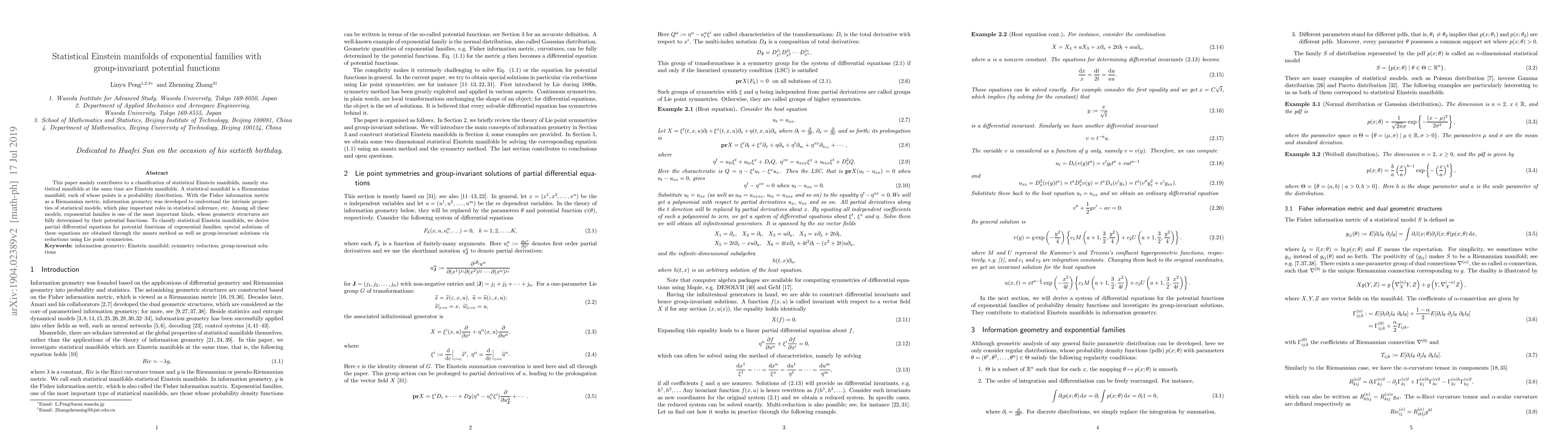 This paper classifies statistical Einstein manifolds, which are statistical manifolds with Einstein metric properties, focusing on exponential families. It derives partial differential equations for potential functions and finds special and group-invariant solutions using Lie point symmetries.