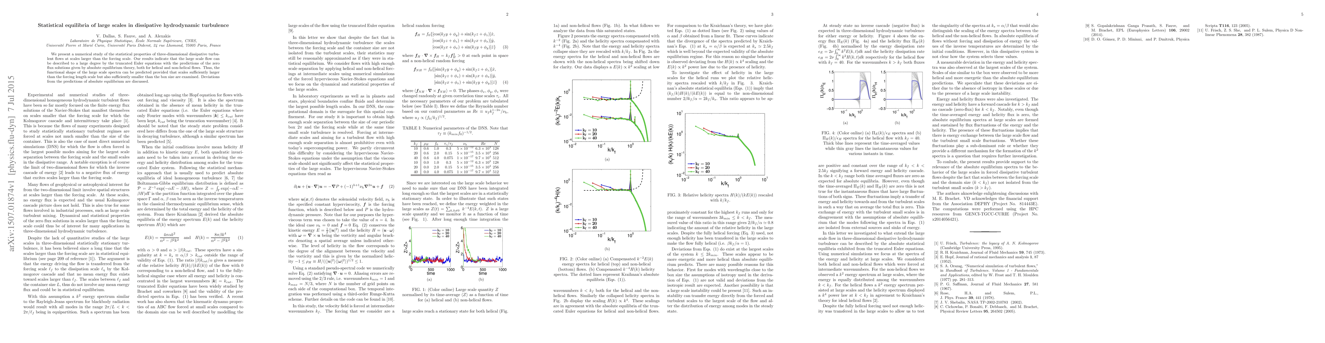 This paper numerically investigates the statistical properties of large-scale turbulent flows in dissipative hydrodynamics, finding that the large-scale flow can be described by truncated Euler equations and zero flux solutions from absolute equilibrium theory. Deviations from these predictions are also examined.