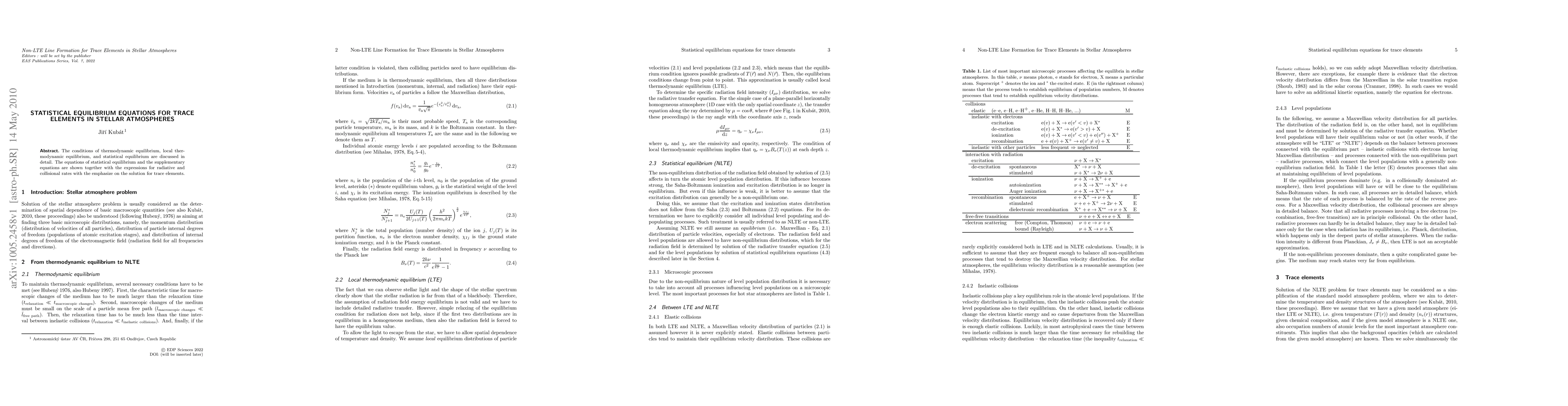 This paper explores the statistical equilibrium equations governing trace elements in stellar atmospheres, focusing on thermodynamic equilibrium conditions, local thermodynamic equilibrium, and the derivation of equations for radiative and collisional rates to solve for trace element behavior.