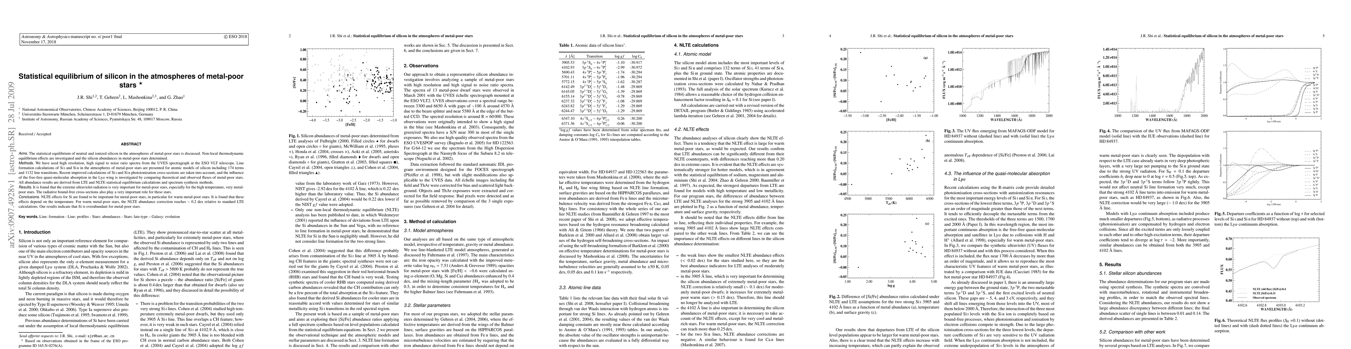 Aims. The statistical equilibrium of neutral and ionized silicon in the atmospheres of metal-poor stars is discussed. Non-local thermodynamic equilibrium effects are investigated and the silicon abundances in metal-poor stars determined. Methods. We have used high resolution, high signal to noise ratio spectra from the UVES spectragraph at the ESO VLT telescope. Line formation calculations of Si i and Si ii in the atmospheres of metal-poor stars are presented for atomic models of silicon including 174 terms and 1132 line transitions. Recent improved calculations of Si i and Si ii photoionization cross-sections are taken into account, and the influence of the free-free quasi-molecular absorption in the Ly alpha wing is investigated by comparing theoretical and observed fluxes of metal-poor stars. All abundance results are derived from LTE and NLTE statistical equilibrium calculations and spectrum synthesis methods. Results. It is found that the extreme ultraviolet radiation is very important for metal-poor stars, especially for the high temperature, very metal-poor stars. The radiative bound-free cross-sections also play a very important role for these stars. Conclusions. NLTE effects for Si are found to be important for metal-poor stars, in particular for warm metal-poor stars. It is found that these effects depend on the temperature. For warm metal-poor stars, the NLTE abundance correction reaches ~ 0.2 dex relative to standard LTE calculations. Our results indicate that Si is overabundant for metal-poor stars.