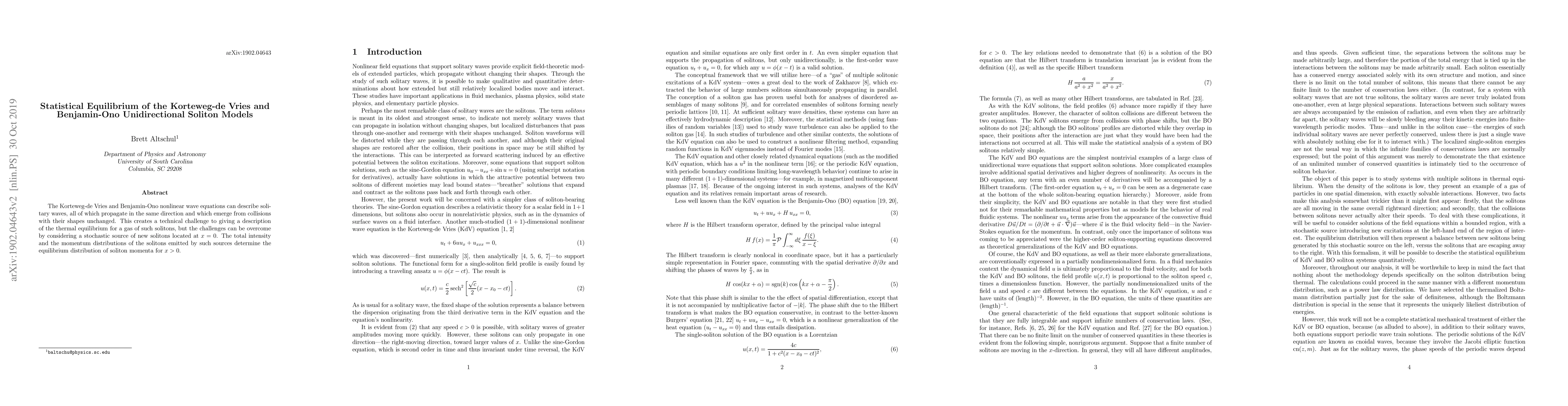 The Korteweg-de Vries and Benjamin-Ono nonlinear wave equations can describe solitary waves, all of which propagate in the same direction and which emerge from collisions with their shapes unchanged. There are technical challenges to giving a description of the thermal equilibrium of a dilute gas of such solitons. These challenges can be overcome by considering a stochastic source of new solitons located at $x=0$. The total intensity and the momentum distributions of the solitons emitted by such sources determine the equilibrium distribution of soliton momenta for $x>0$.