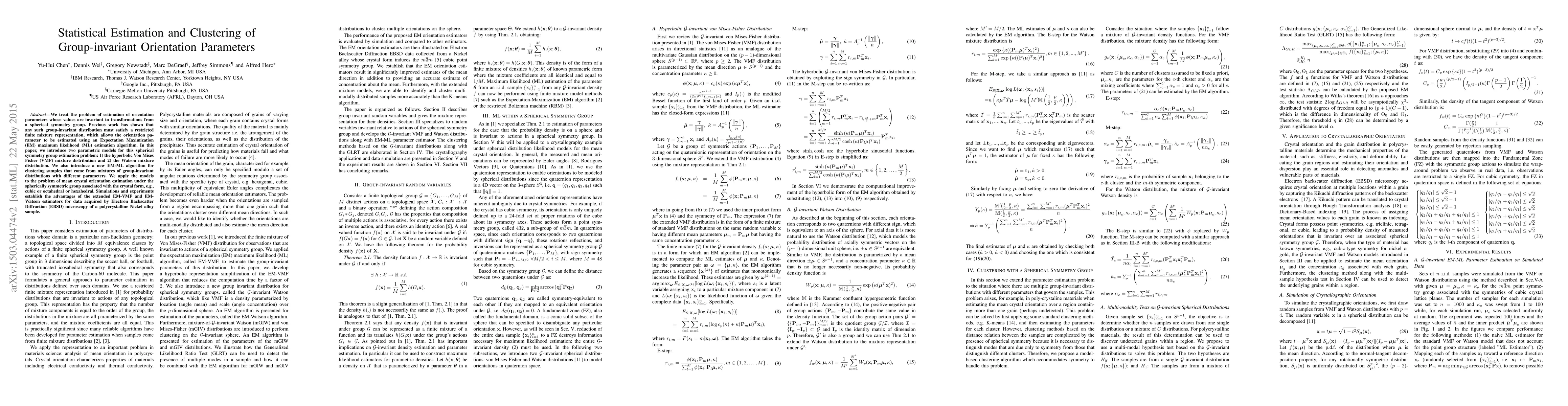 We treat the problem of estimation of orientation parameters whose values are invariant to transformations from a spherical symmetry group. Previous work has shown that any such group-invariant distribution must satisfy a restricted finite mixture representation, which allows the orientation parameter to be estimated using an Expectation Maximization (EM) maximum likelihood (ML) estimation algorithm. In this paper, we introduce two parametric models for this spherical symmetry group estimation problem: 1) the hyperbolic Von Mises Fisher (VMF) mixture distribution and 2) the Watson mixture distribution. We also introduce a new EM-ML algorithm for clustering samples that come from mixtures of group-invariant distributions with different parameters. We apply the models to the problem of mean crystal orientation estimation under the spherically symmetric group associated with the crystal form, e.g., cubic or octahedral or hexahedral. Simulations and experiments establish the advantages of the extended EM-VMF and EM-Watson estimators for data acquired by Electron Backscatter Diffraction (EBSD) microscopy of a polycrystalline Nickel alloy sample.
