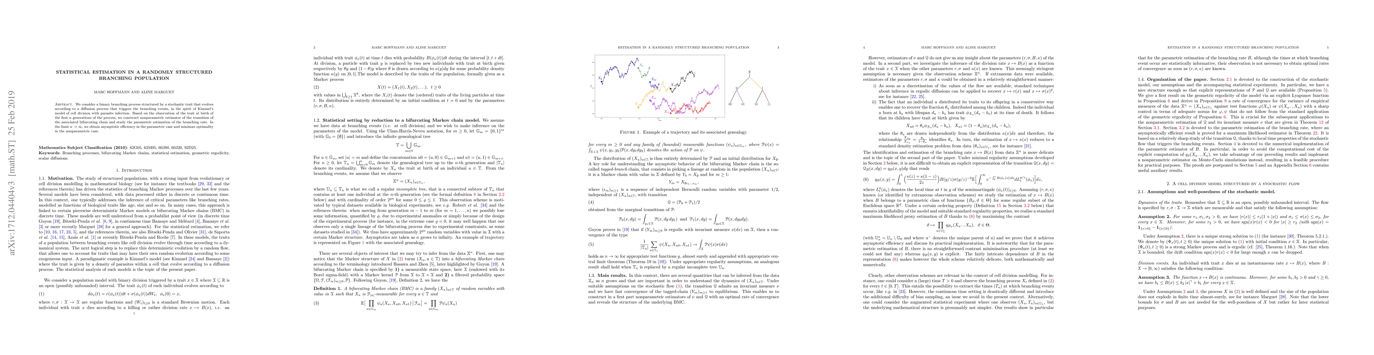 We consider a binary branching process structured by a stochastic trait that evolves according to a diffusion process that triggers the branching events, in the spirit of Kimmel's model of cell division with parasite infection. Based on the observation of the trait at birth of the first n generations of the process, we construct nonparametric estimator of the transition of the associated bifurcating chain and study the parametric estimation of the branching rate. In the limit, as n tends to infinity, we obtain asymptotic efficiency in the parametric case and minimax optimality in the nonparametric case.