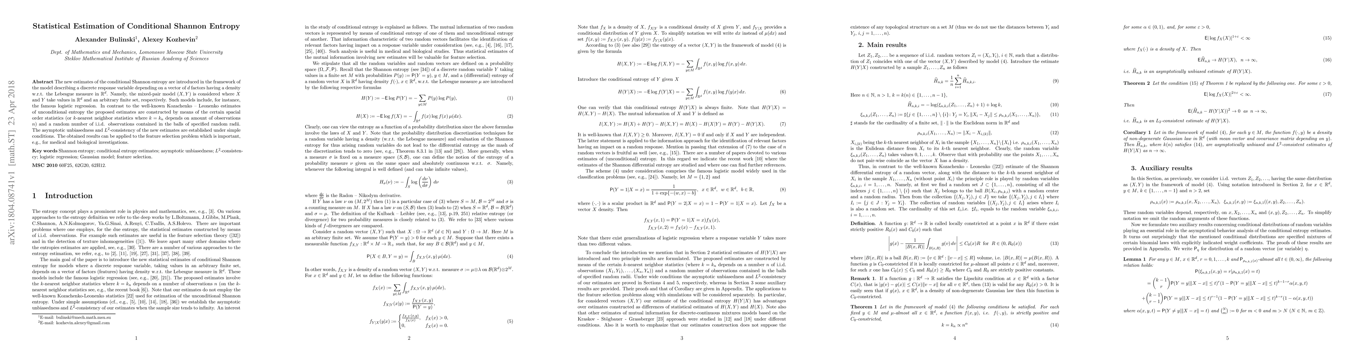 This paper introduces new estimates of conditional Shannon entropy using spatial order statistics and independent and identically distributed observations, with established asymptotic unbiasedness and L^2-consistency for feature selection applications.