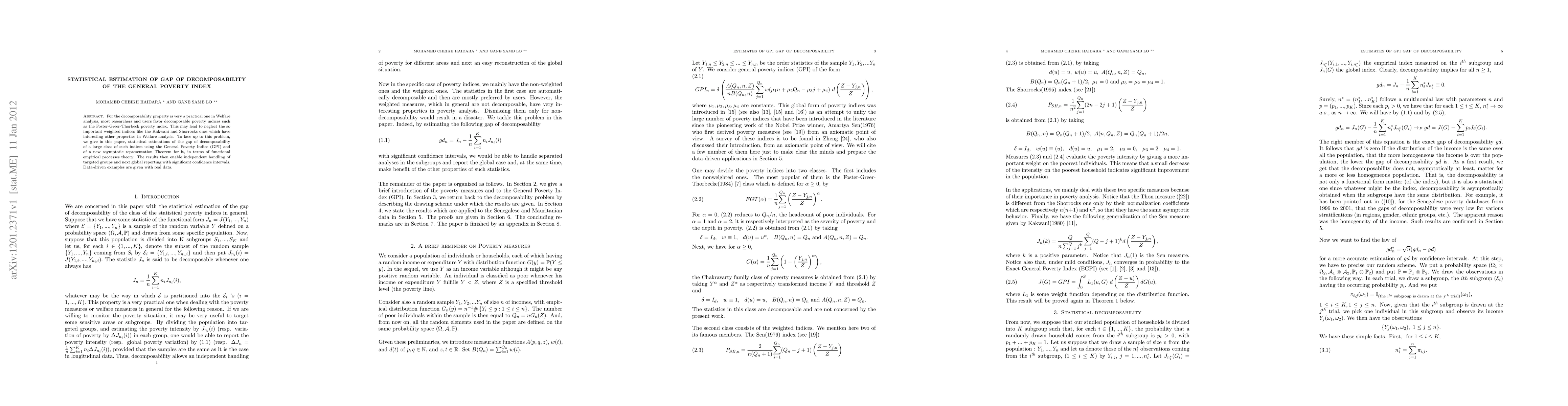 For the decomposability property is very a practical one in Welfare analysis, most researchers and users favor decomposable poverty indices such as the Foster-Greer-Thorbeck poverty index. This may lead to neglect the so important weighted indices like the Kakwani and Shorrocks ones which have interesting other properties in Welfare analysis. To face up to this problem, we give in this paper, statistical estimations of the gap of decomposability of a large class of such indices using the General Poverty Indice (GPI) and of a new asymptotic representation Theorem for it, in terms of functional empirical processes theory. The results then enable independent handling of targeted groups and next global reporting with significant confidence intervals. Data-driven examples are given with real data.