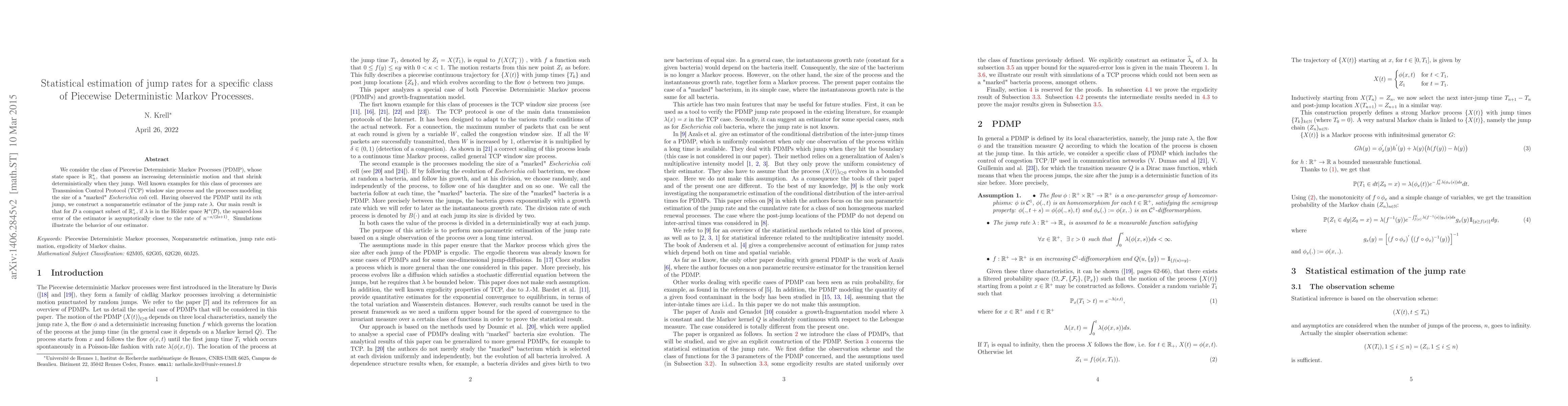 We consider the class of Piecewise Deterministic Markov Processes (PDMP), whose state space is $\R\_{+}^{*}$, that possess an increasing deterministic motion and that shrink deterministically when they jump. Well known examples for this class of processes are Transmission Control Protocol (TCP) window size process and the processes modeling the size of a "marked" {\it Escherichia coli} cell. Having observed the PDMP until its $n$th jump, we construct a nonparametric estimator of the jump rate $\lambda$. Our main result is that for $D$ a compact subset of $\R\_{+}^{*}$, if $\lambda$ is in the H{\''{o}}lder space ${\mathcal H}^s({\mathcal D})$, the squared-loss error of the estimator is asymptotically close to the rate of $n^{-s/(2s+1)}$. Simulations illustrate the behavior of our estimator.