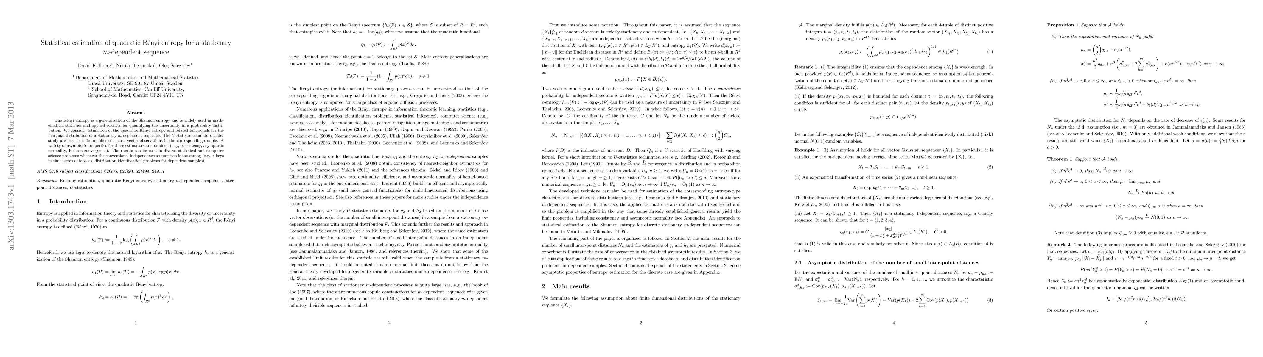 The R\'enyi entropy is a generalization of the Shannon entropy and is widely used in mathematical statistics and applied sciences for quantifying the uncertainty in a probability distribution. We consider estimation of the quadratic R\'enyi entropy and related functionals for the marginal distribution of a stationary m-dependent sequence. The U-statistic estimators under study are based on the number of epsilon-close vector observations in the corresponding sample. A variety of asymptotic properties for these estimators are obtained (e.g., consistency, asymptotic normality, Poisson convergence). The results can be used in diverse statistical and computer science problems whenever the conventional independence assumption is too strong (e.g., epsilon-keys in time series databases, distribution identification problems for dependent samples).