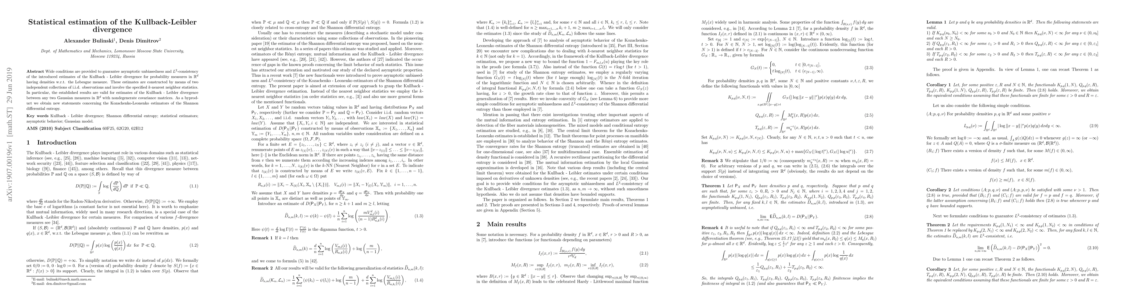 This paper presents statistical estimates for the Kullback-Leibler divergence between probability measures in R^d, ensuring their asymptotic unbiasedness and L^2-consistency. The estimates utilize k-nearest neighbor statistics derived from two independent samples, with particular validity for Gaussian measures.