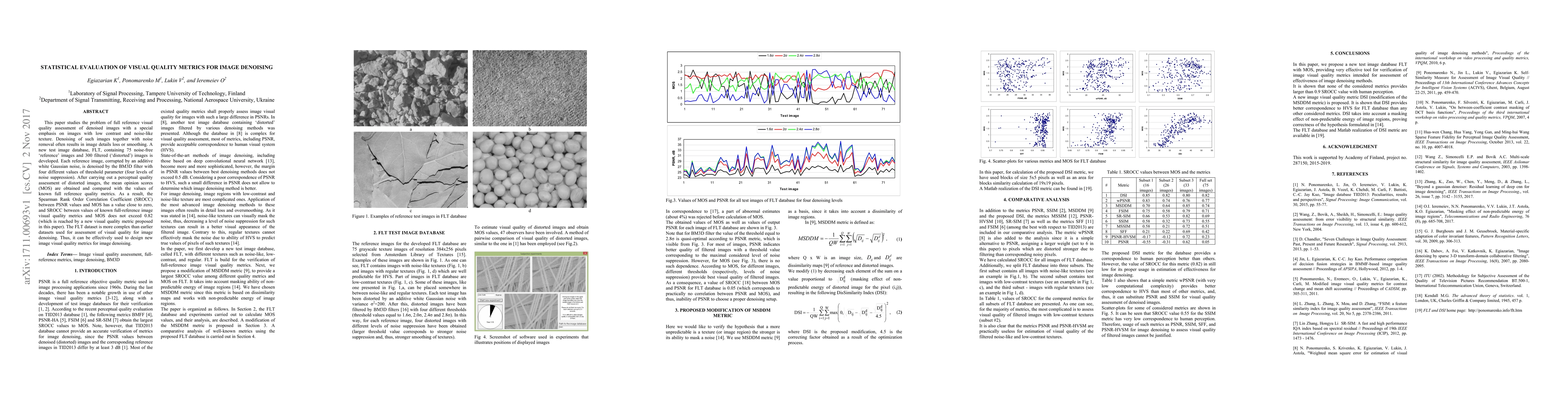 This research evaluates image denoising quality using visual metrics, focusing on low-contrast, noise-textured images. A new test dataset, FLT, with 75 reference and 300 distorted images is created. Results show existing metrics' SROCC with MOS does not exceed 0.82, while a new proposed metric performs better. The FLT dataset aids in designing advanced image quality metrics for denoising.