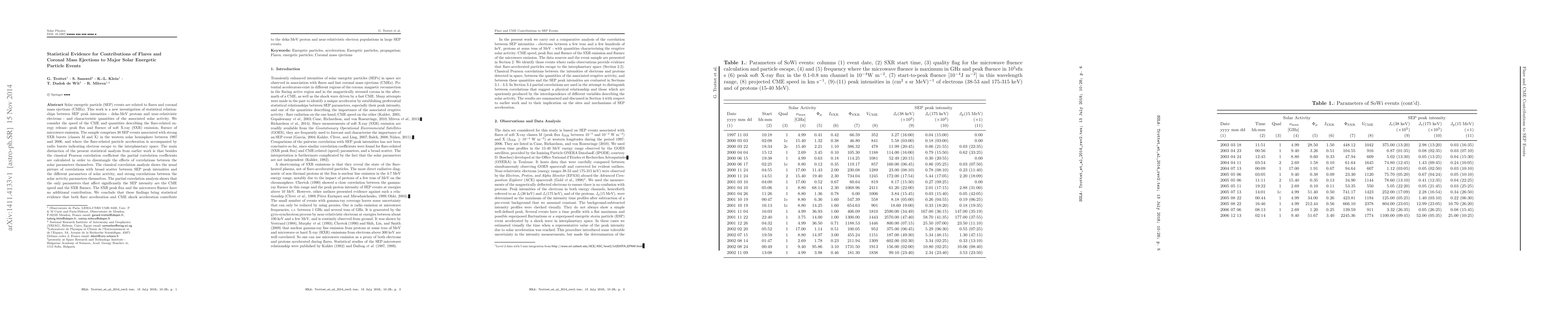 This paper investigates statistical relationships between solar energetic particle (SEP) peak intensities and solar activity parameters, including CME speed and flare-related energy release. The analysis reveals that CME speed and soft X-ray fluence significantly influence SEP intensities, indicating that both flare and CME acceleration mechanisms contribute to large SEP events.